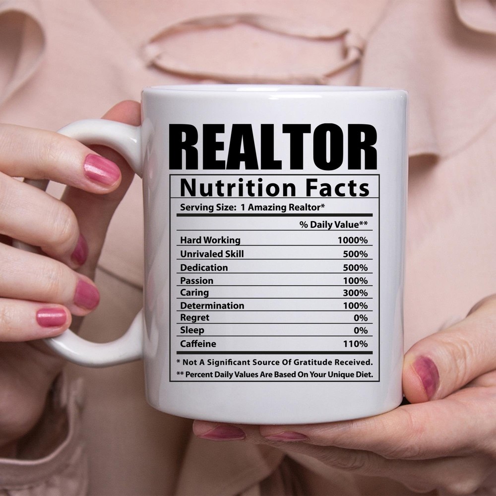 Funny Realtor Nutritional Facts White Coffee Mug Product Details.. This high quality 11oz. ceramic white mug has a premium hard coat that provides crisp and vibrant color reproduction sure to last for years. Perfect for all hot & cold beverages. The highest quality printing possible is used. It will never fade no matter how many times you wash it. Material: 100% Ceramic. Print both sides. Dishwasher and Microwave Safe. High Gloss + Premium White Finish. Printed in the U.S.A. Personalized & Custom. We support personalized and custom mug to add custom, when placing an order, you can add notes to the "order note" in shipping address section. Also you can contact us directly via message. Shipping Info. Ready to ship in 1 to 2 business days, All products are made-to-order and proudly printed in the United States. Shipped by USPS and DHL, You will receive your order in 5-7 days. Replace & Refund. All products are defective during shipping broken, chipped will be replaced free of charge. You are not satisfied with the product, we will refund 100% money to you. If any other issues arise, please do not hesitate to message, we would be more than happy to assist you.