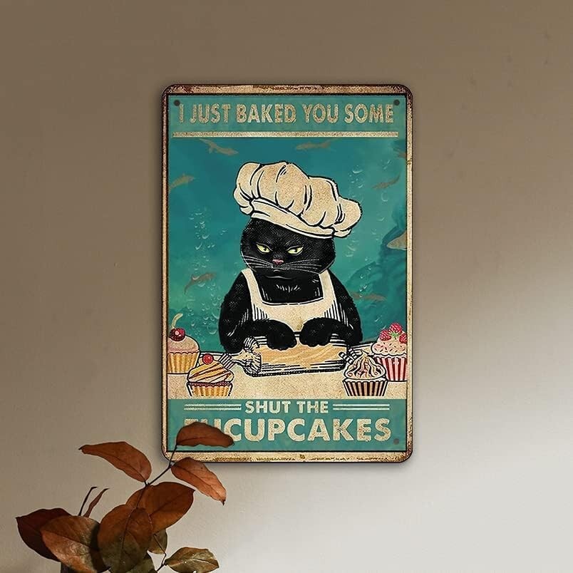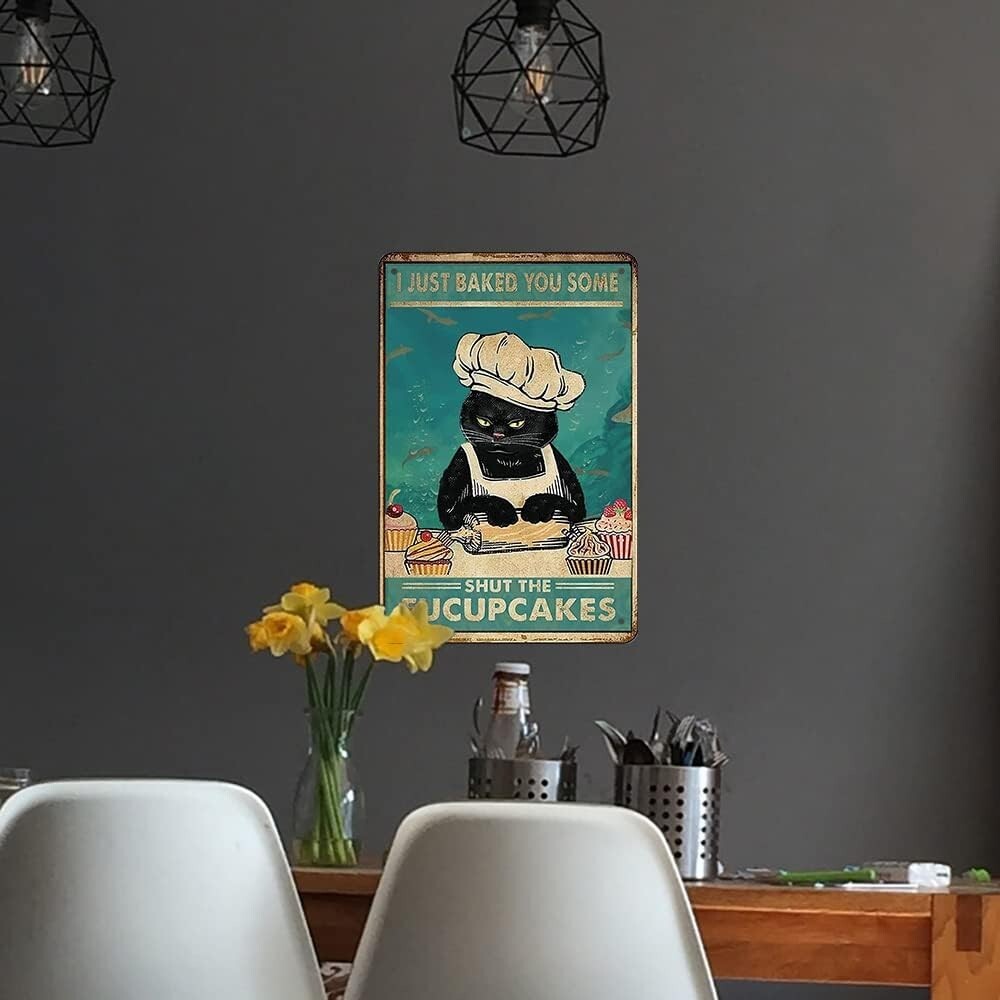 Funny Retro Cat Bakes Cakes Metal Tin Sign Vintage Kitchen Coffee Bar Wall Art Funny Cat Kitchen Sign: Our Cat art metal signs allow you to have your own unique style,Well designed with a vintage feel for indoor and outdoor use. Retro Cat Sign Size: 8 x 12 inches, our cat metal tin signs come with 4 pre-drilled holes (screws or nails not included) for easy hanging. Funny Cat Kitchen Decor: Cat Metal tin sign is the perfect gift that always draws attention to make life more interesting. Cat Coffee decor Versatile: Not only for kitchens and wall decorations, but also for doors, tables, coffee bar, etc. It will bring a smile to everyone's face.