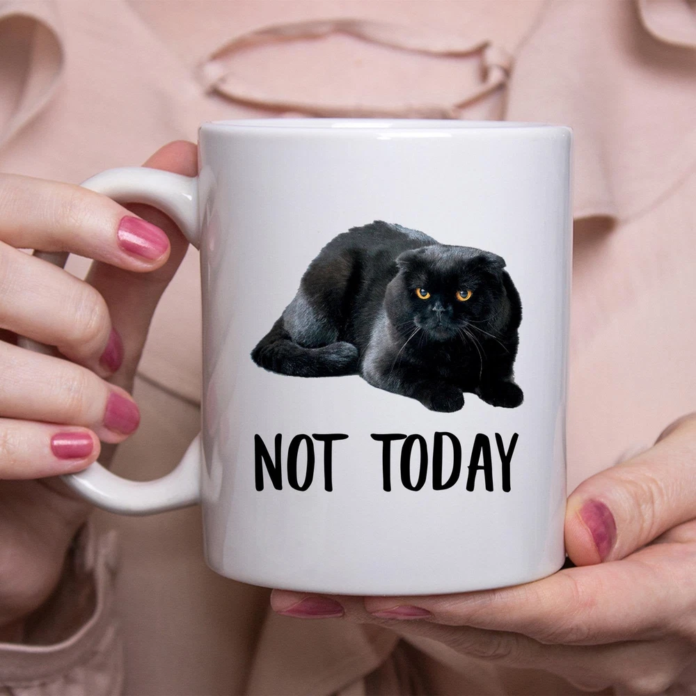 Funny Scottish Fold Cat Black Not Today Cat Mug Lazy Gift For Cats Lovers Coffee Product Details.. This high quality 11oz. ceramic white mug has a premium hard coat that provides crisp and vibrant color reproduction sure to last for years. Perfect for all hot & cold beverages. The highest quality printing possible is used. It will never fade no matter how many times you wash it. Material: 100% Ceramic. Print both sides. Dishwasher and Microwave Safe. High Gloss + Premium White Finish. Printed in the U.S.A. Personalized & Custom. We support personalized and custom mug to add custom, when placing an order, you can add notes to the "order note" in shipping address section. Also you can contact us directly via message. Shipping Info. Ready to ship in 1 to 2 business days, All products are made-to-order and proudly printed in the United States. Shipped by USPS and DHL, You will receive your order in 5-7 days. Replace & Refund. All products are defective during shipping broken, chipped will be replaced free of charge. You are not satisfied with the product, we will refund 100% money to you. If any other issues arise, please do not hesitate to message, we would be more than happy to assist you.