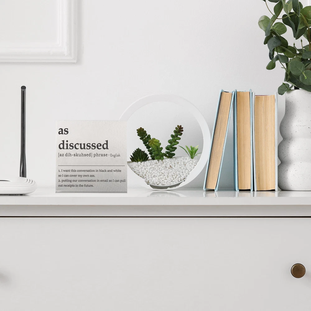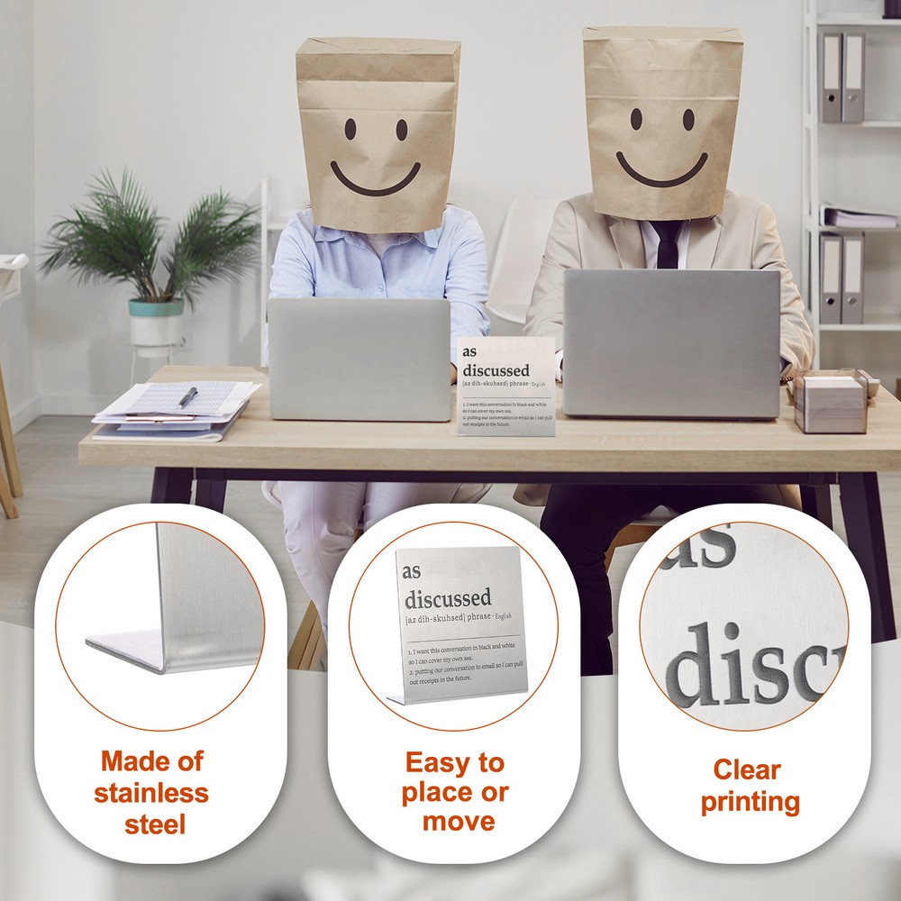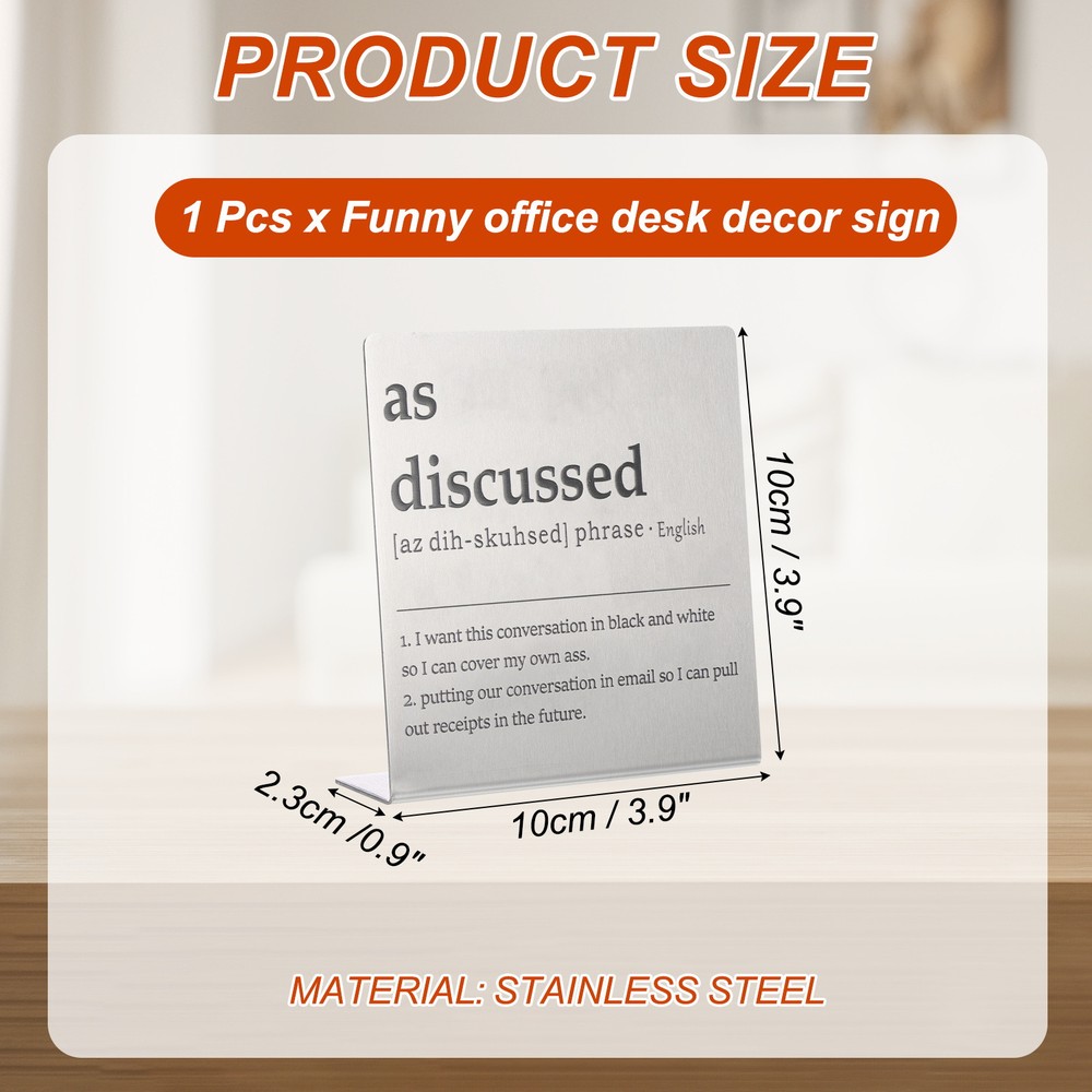 Document MULTIPURPOSE - Funny desk decoration signs use humorous sentences to inspire smile and liven up the office atmosphere, bringing personality and fun to any workspace. Perfect for birthdays, events, home, and office decorationWHAT YOU GET - 1 x Funny office desk decor sign. And their sizes are: 10cm x 2.3cm x 10cm / 3.9inch x 0.9inch x 3.9inch(L*W*H); Material: Stainless steel; Color: Silver; Style: as discussedRELIABLE MATERIAL - The funny desk decoration sign is made of stainless steel, which is strong and not easy to deform, waterproof and rust-proof, and durable. It is small in size and easy to place or move on the desk, and it does not take up too much space. The interesting title content has both decorative effects and brings fun.WIDELY USED - Funny office desk decor sign has a wide range of applications. It can be placed on the desk to decorate and bring fun to busy coworkers. It can be placed on bookshelves and wall cabinets to decorate the corners of the home. It can also be given to friends, colleague as interesting gifts.KINDLY NOTE - Please pay attention to the style and size of the title before purchasing Funny Desk Sign, Funny Nameplate, Silver (as Discussed) MULTIPURPOSE - Funny desk decoration signs use humorous sentences to inspire smile and liven up the office atmosphere, bringing personality and fun to any workspace. Perfect for birthdays, events, home, and office decoration WHAT YOU GET - 1 x Funny office desk decor sign. And their sizes are: 10cm x 2.3cm x 10cm / 3.9inch x 0.9inch x 3.9inch(L*W*H); Material: Stainless steel; Color: Silver; Style: as discussed RELIABLE MATERIAL - The funny desk decoration sign is made of stainless steel, which is strong and not easy to deform, waterproof and rust-proof, and durable. It is small in size and easy to place or move on the desk, and it does not take up too much space. The interesting title content has both decorative effects and brings fun. WIDELY USED - Funny office desk decor sign has a wide range of applications. It can be placed on the desk to decorate and bring fun to busy coworkers. It can be placed on bookshelves and wall cabinets to decorate the corners of the home. It can also be given to friends, colleague as interesting gifts. KINDLY NOTE - Please pay attention to the style and size of the title before purchasing Hot Item Payment 1.We accept eBay payment . 2.Payment must be received within 7 business days of auction closing. Shipping 1.We ship to your eBay or Paypal address. Please make sure your eBay and Paypal address is correct before you pay. 2.Items will be shipped within 1-3 business day when we received payment. 3.Delivery time depends on destination and other factors. Description Policy Funny Desk Sign, Funny Nameplate, Silver (as Discussed) MULTIPURPOSE - Funny desk decoration signs use humorous sentences to inspire smile and liven up the office atmosphere, bringing personality and fun to any workspace. Perfect for birthdays, events, home, and office decoration WHAT YOU GET - 1 x Funny office desk decor sign. And their sizes are: 10cm x 2.3cm x 10cm / 3.9inch x 0.9inch x 3.9inch(L*W*H); Material: Stainless steel; Color: Silver; Style: as discussed RELIABLE MATERIAL - The funny desk decoration sign is made of stainless steel, which is strong and not easy to deform, waterproof and rust-proof, and durable. It is small in size and easy to place or move on the desk, and it does not take up too much space. The interesting title content has both decorative effects and brings fun. WIDELY USED - Funny office desk decor sign has a wide range of applications. It can be placed on the desk to decorate and bring fun to busy coworkers. It can be placed on bookshelves and wall cabinets to decorate the corners of the home. It can also be given to friends, colleague as interesting gifts. KINDLY NOTE - Please pay attention to the style and size of the title before purchasing Hot Item Payment 1.We accept eBay payment . 2.Payment must be received within 7 business days of auction closing. Shipping 1.We ship to your eBay or Paypal address. Please make sure your eBay and Paypal address is correct before you pay. 2.Items will be shipped within 1-3 business day when we received payment. 3.Delivery time depends on destination and other factors.