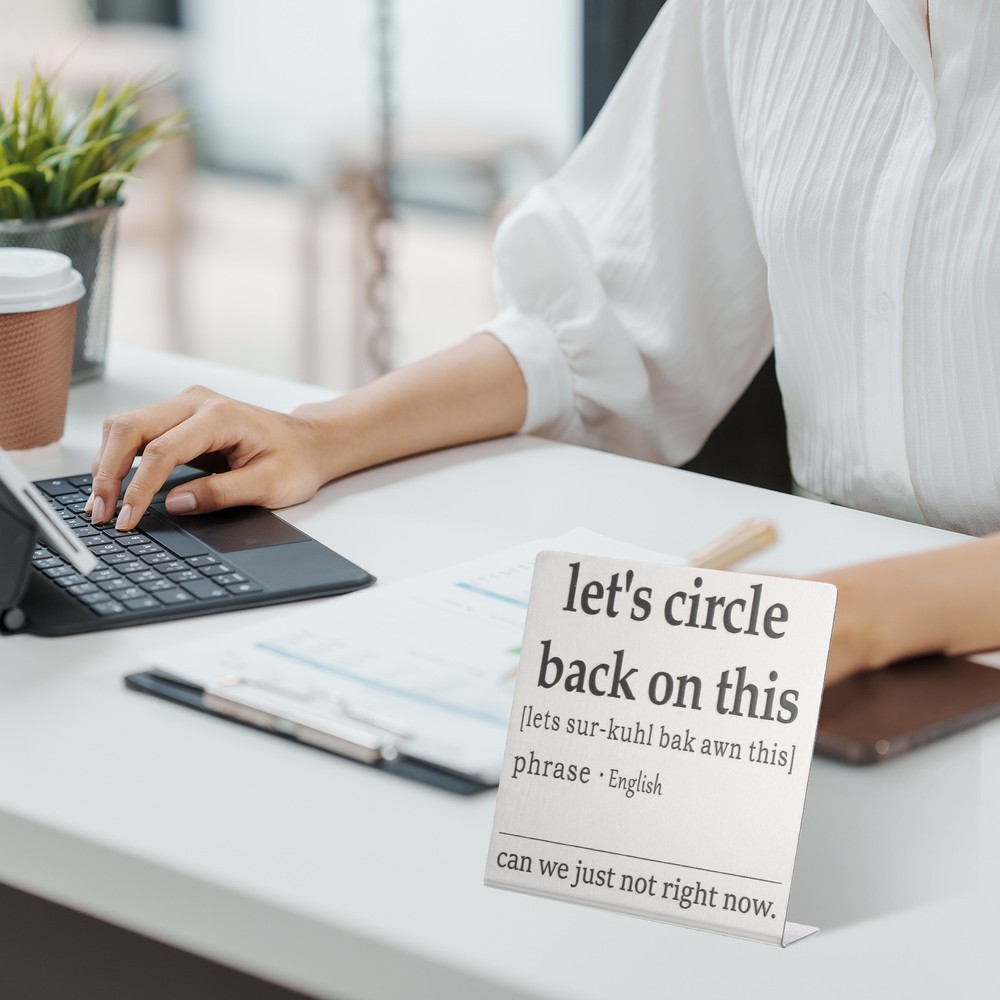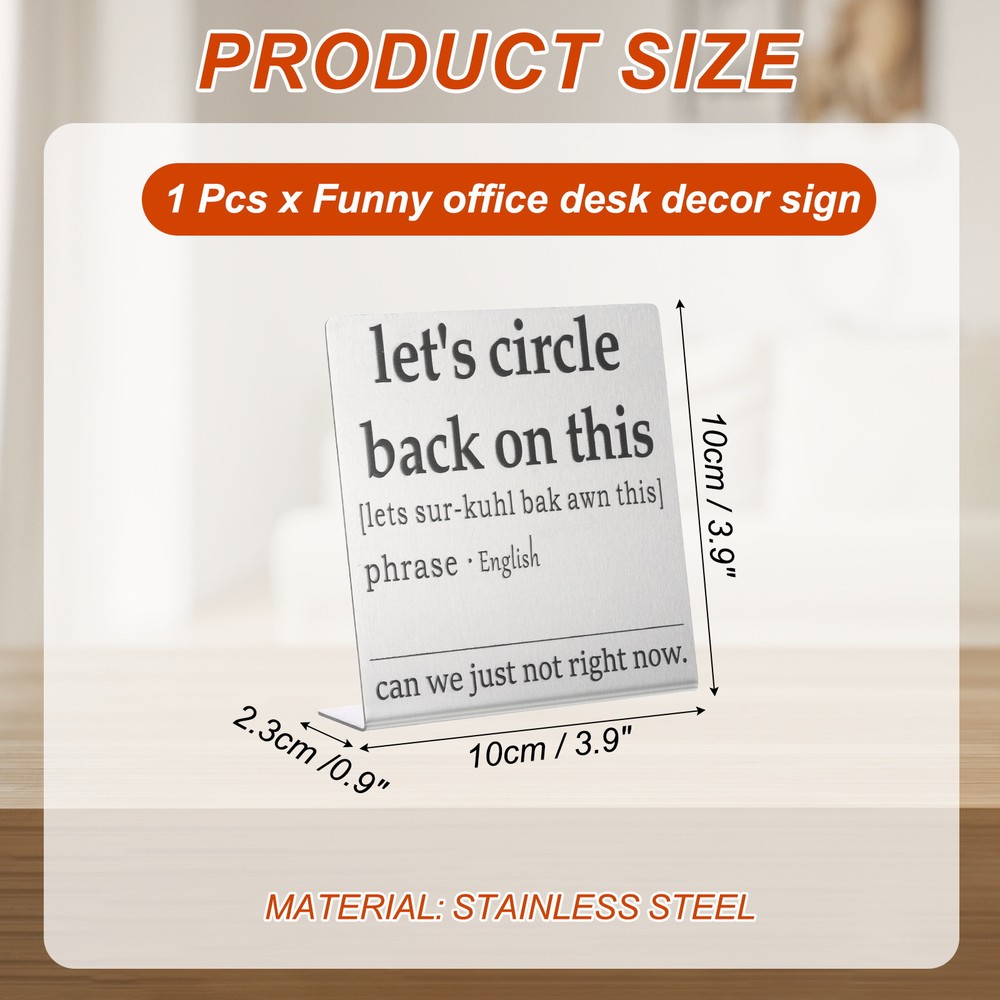 Document MULTIPURPOSE - Funny desk decoration signs use humorous sentences to inspire smile and liven up the office atmosphere, bringing personality and fun to any workspace. Perfect for birthdays, events, home, and office decorationWHAT YOU GET - 1 x Funny office desk decor sign. And their sizes are: 10cm x 2.3cm x 10cm / 3.9inch x 0.9inch x 3.9inch(L*W*H); Material: Stainless steel; Color: Silver; Style: let's circle back on thisRELIABLE MATERIAL - The funny desk decoration sign is made of stainless steel, which is strong and not easy to deform, waterproof and rust-proof, and durable. It is small in size and easy to place or move on the desk, and it does not take up too much space. The interesting title content has both decorative effects and brings fun.WIDELY USED - Funny office desk decor sign has a wide range of applications. It can be placed on the desk to decorate and bring fun to busy coworkers. It can be placed on bookshelves and wall cabinets to decorate the corners of the home. It can also be given to friends, colleague as interesting gifts.KINDLY NOTE - Please pay attention to the style and size of the title before purchasing Funny Desk Sign, Funny Nameplate, Silver (let's Circle Back on This) MULTIPURPOSE - Funny desk decoration signs use humorous sentences to inspire smile and liven up the office atmosphere, bringing personality and fun to any workspace. Perfect for birthdays, events, home, and office decoration WHAT YOU GET - 1 x Funny office desk decor sign. And their sizes are: 10cm x 2.3cm x 10cm / 3.9inch x 0.9inch x 3.9inch(L*W*H); Material: Stainless steel; Color: Silver; Style: let's circle back on this RELIABLE MATERIAL - The funny desk decoration sign is made of stainless steel, which is strong and not easy to deform, waterproof and rust-proof, and durable. It is small in size and easy to place or move on the desk, and it does not take up too much space. The interesting title content has both decorative effects and brings fun. WIDELY USED - Funny office desk decor sign has a wide range of applications. It can be placed on the desk to decorate and bring fun to busy coworkers. It can be placed on bookshelves and wall cabinets to decorate the corners of the home. It can also be given to friends, colleague as interesting gifts. KINDLY NOTE - Please pay attention to the style and size of the title before purchasing Hot Item Payment 1.We accept eBay payment . 2.Payment must be received within 7 business days of auction closing. Shipping 1.We ship to your eBay or Paypal address. Please make sure your eBay and Paypal address is correct before you pay. 2.Items will be shipped within 1-3 business day when we received payment. 3.Delivery time depends on destination and other factors. Description Policy Funny Desk Sign, Funny Nameplate, Silver (let's Circle Back on This) MULTIPURPOSE - Funny desk decoration signs use humorous sentences to inspire smile and liven up the office atmosphere, bringing personality and fun to any workspace. Perfect for birthdays, events, home, and office decoration WHAT YOU GET - 1 x Funny office desk decor sign. And their sizes are: 10cm x 2.3cm x 10cm / 3.9inch x 0.9inch x 3.9inch(L*W*H); Material: Stainless steel; Color: Silver; Style: let's circle back on this RELIABLE MATERIAL - The funny desk decoration sign is made of stainless steel, which is strong and not easy to deform, waterproof and rust-proof, and durable. It is small in size and easy to place or move on the desk, and it does not take up too much space. The interesting title content has both decorative effects and brings fun. WIDELY USED - Funny office desk decor sign has a wide range of applications. It can be placed on the desk to decorate and bring fun to busy coworkers. It can be placed on bookshelves and wall cabinets to decorate the corners of the home. It can also be given to friends, colleague as interesting gifts. KINDLY NOTE - Please pay attention to the style and size of the title before purchasing Hot Item Payment 1.We accept eBay payment . 2.Payment must be received within 7 business days of auction closing. Shipping 1.We ship to your eBay or Paypal address. Please make sure your eBay and Paypal address is correct before you pay. 2.Items will be shipped within 1-3 business day when we received payment. 3.Delivery time depends on destination and other factors.