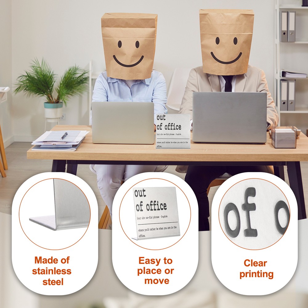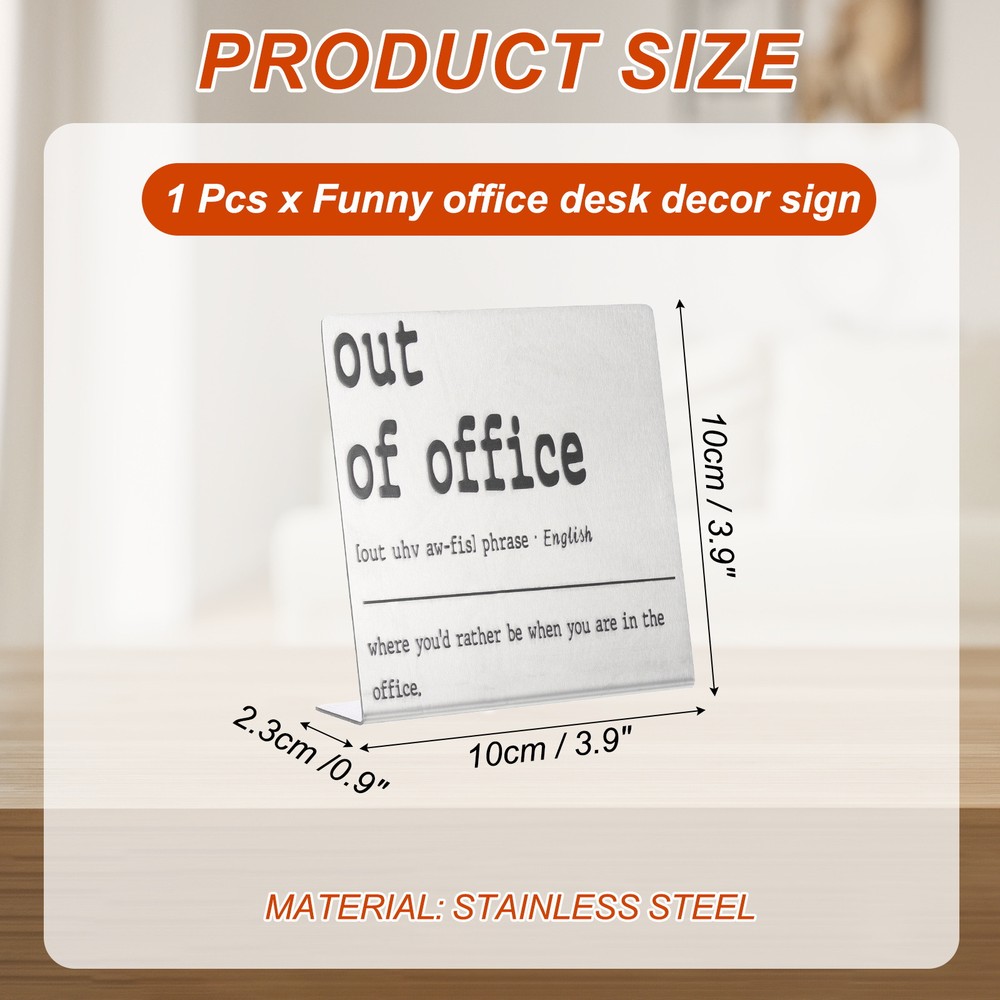 Document MULTIPURPOSE - Funny desk decoration signs use humorous sentences to inspire smile and liven up the office atmosphere, bringing personality and fun to any workspace. Perfect for birthdays, events, home, and office decorationWHAT YOU GET - 1 x Funny office desk decor sign. And their sizes are: 10cm x 2.3cm x 10cm / 3.9inch x 0.9inch x 3.9inch(L*W*H); Material: Stainless steel; Color: Silver; Style: out of officeRELIABLE MATERIAL - The funny desk decoration sign is made of stainless steel, which is strong and not easy to deform, waterproof and rust-proof, and durable. It is small in size and easy to place or move on the desk, and it does not take up too much space. The interesting title content has both decorative effects and brings fun.WIDELY USED - Funny office desk decor sign has a wide range of applications. It can be placed on the desk to decorate and bring fun to busy coworkers. It can be placed on bookshelves and wall cabinets to decorate the corners of the home. It can also be given to friends, colleague as interesting gifts.KINDLY NOTE - Please pay attention to the style and size of the title before purchasing Funny Desk Sign, Funny Nameplate, Silver (out of Office) MULTIPURPOSE - Funny desk decoration signs use humorous sentences to inspire smile and liven up the office atmosphere, bringing personality and fun to any workspace. Perfect for birthdays, events, home, and office decoration WHAT YOU GET - 1 x Funny office desk decor sign. And their sizes are: 10cm x 2.3cm x 10cm / 3.9inch x 0.9inch x 3.9inch(L*W*H); Material: Stainless steel; Color: Silver; Style: out of office RELIABLE MATERIAL - The funny desk decoration sign is made of stainless steel, which is strong and not easy to deform, waterproof and rust-proof, and durable. It is small in size and easy to place or move on the desk, and it does not take up too much space. The interesting title content has both decorative effects and brings fun. WIDELY USED - Funny office desk decor sign has a wide range of applications. It can be placed on the desk to decorate and bring fun to busy coworkers. It can be placed on bookshelves and wall cabinets to decorate the corners of the home. It can also be given to friends, colleague as interesting gifts. KINDLY NOTE - Please pay attention to the style and size of the title before purchasing Hot Item Payment 1.We accept eBay payment . 2.Payment must be received within 7 business days of auction closing. Shipping 1.We ship to your eBay or Paypal address. Please make sure your eBay and Paypal address is correct before you pay. 2.Items will be shipped within 1-3 business day when we received payment. 3.Delivery time depends on destination and other factors. Description Policy Funny Desk Sign, Funny Nameplate, Silver (out of Office) MULTIPURPOSE - Funny desk decoration signs use humorous sentences to inspire smile and liven up the office atmosphere, bringing personality and fun to any workspace. Perfect for birthdays, events, home, and office decoration WHAT YOU GET - 1 x Funny office desk decor sign. And their sizes are: 10cm x 2.3cm x 10cm / 3.9inch x 0.9inch x 3.9inch(L*W*H); Material: Stainless steel; Color: Silver; Style: out of office RELIABLE MATERIAL - The funny desk decoration sign is made of stainless steel, which is strong and not easy to deform, waterproof and rust-proof, and durable. It is small in size and easy to place or move on the desk, and it does not take up too much space. The interesting title content has both decorative effects and brings fun. WIDELY USED - Funny office desk decor sign has a wide range of applications. It can be placed on the desk to decorate and bring fun to busy coworkers. It can be placed on bookshelves and wall cabinets to decorate the corners of the home. It can also be given to friends, colleague as interesting gifts. KINDLY NOTE - Please pay attention to the style and size of the title before purchasing Hot Item Payment 1.We accept eBay payment . 2.Payment must be received within 7 business days of auction closing. Shipping 1.We ship to your eBay or Paypal address. Please make sure your eBay and Paypal address is correct before you pay. 2.Items will be shipped within 1-3 business day when we received payment. 3.Delivery time depends on destination and other factors.