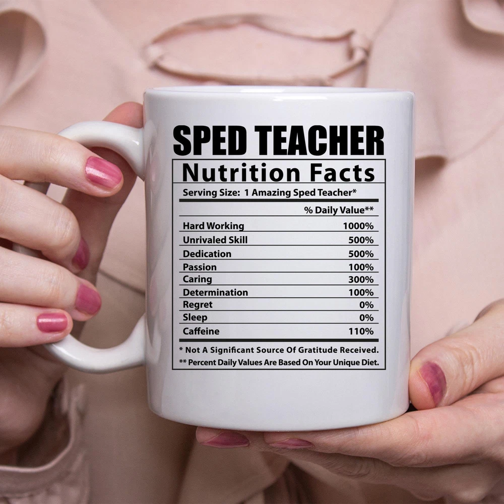 Funny Sped Teacher Nutritional Facts White Coffee Mug Product Details.. This high quality 11oz. ceramic white mug has a premium hard coat that provides crisp and vibrant color reproduction sure to last for years. Perfect for all hot & cold beverages. The highest quality printing possible is used. It will never fade no matter how many times you wash it. Material: 100% Ceramic. Print both sides. Dishwasher and Microwave Safe. High Gloss + Premium White Finish. Printed in the U.S.A. Personalized & Custom. We support personalized and custom mug to add custom, when placing an order, you can add notes to the "order note" in shipping address section. Also you can contact us directly via message. Shipping Info. Ready to ship in 1 to 2 business days, All products are made-to-order and proudly printed in the United States. Shipped by USPS and DHL, You will receive your order in 5-7 days. Replace & Refund. All products are defective during shipping broken, chipped will be replaced free of charge. You are not satisfied with the product, we will refund 100% money to you. If any other issues arise, please do not hesitate to message, we would be more than happy to assist you.