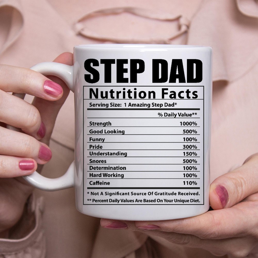 Funny Step Dad Gifts Nutritional Facts White Coffee Mug Product Details.. This high quality 11oz. ceramic white mug has a premium hard coat that provides crisp and vibrant color reproduction sure to last for years. Perfect for all hot & cold beverages. The highest quality printing possible is used. It will never fade no matter how many times you wash it. Material: 100% Ceramic. Print both sides. Dishwasher and Microwave Safe. High Gloss + Premium White Finish. Printed in the U.S.A. Personalized & Custom. We support personalized and custom mug to add custom, when placing an order, you can add notes to the "order note" in shipping address section. Also you can contact us directly via message. Shipping Info. Ready to ship in 1 to 2 business days, All products are made-to-order and proudly printed in the United States. Shipped by USPS and DHL, You will receive your order in 5-7 days. Replace & Refund. All products are defective during shipping broken, chipped will be replaced free of charge. You are not satisfied with the product, we will refund 100% money to you. If any other issues arise, please do not hesitate to message, we would be more than happy to assist you.