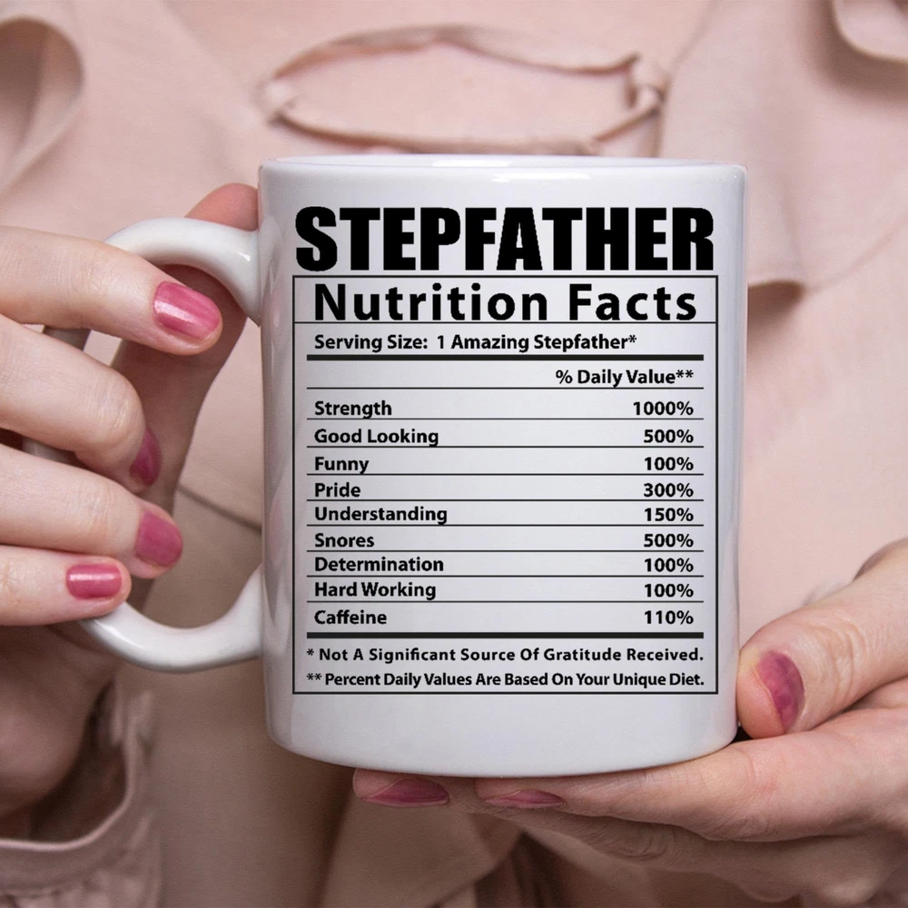 Funny Stepfather Gifts Nutritional Facts White Coffee Mug Product Details.. This high quality 11oz. ceramic white mug has a premium hard coat that provides crisp and vibrant color reproduction sure to last for years. Perfect for all hot & cold beverages. The highest quality printing possible is used. It will never fade no matter how many times you wash it. Material: 100% Ceramic. Print both sides. Dishwasher and Microwave Safe. High Gloss + Premium White Finish. Printed in the U.S.A. Personalized & Custom. We support personalized and custom mug to add custom, when placing an order, you can add notes to the "order note" in shipping address section. Also you can contact us directly via message. Shipping Info. Ready to ship in 1 to 2 business days, All products are made-to-order and proudly printed in the United States. Shipped by USPS and DHL, You will receive your order in 5-7 days. Replace & Refund. All products are defective during shipping broken, chipped will be replaced free of charge. You are not satisfied with the product, we will refund 100% money to you. If any other issues arise, please do not hesitate to message, we would be more than happy to assist you.