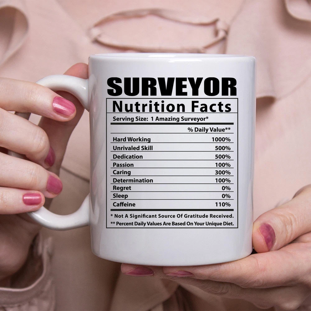 Funny Surveyor Nutritional Facts White Coffee Mug Product Details.. This high quality 11oz. ceramic white mug has a premium hard coat that provides crisp and vibrant color reproduction sure to last for years. Perfect for all hot & cold beverages. The highest quality printing possible is used. It will never fade no matter how many times you wash it. Material: 100% Ceramic. Print both sides. Dishwasher and Microwave Safe. High Gloss + Premium White Finish. Printed in the U.S.A. Personalized & Custom. We support personalized and custom mug to add custom, when placing an order, you can add notes to the "order note" in shipping address section. Also you can contact us directly via message. Shipping Info. Ready to ship in 1 to 2 business days, All products are made-to-order and proudly printed in the United States. Shipped by USPS and DHL, You will receive your order in 5-7 days. Replace & Refund. All products are defective during shipping broken, chipped will be replaced free of charge. You are not satisfied with the product, we will refund 100% money to you. If any other issues arise, please do not hesitate to message, we would be more than happy to assist you.