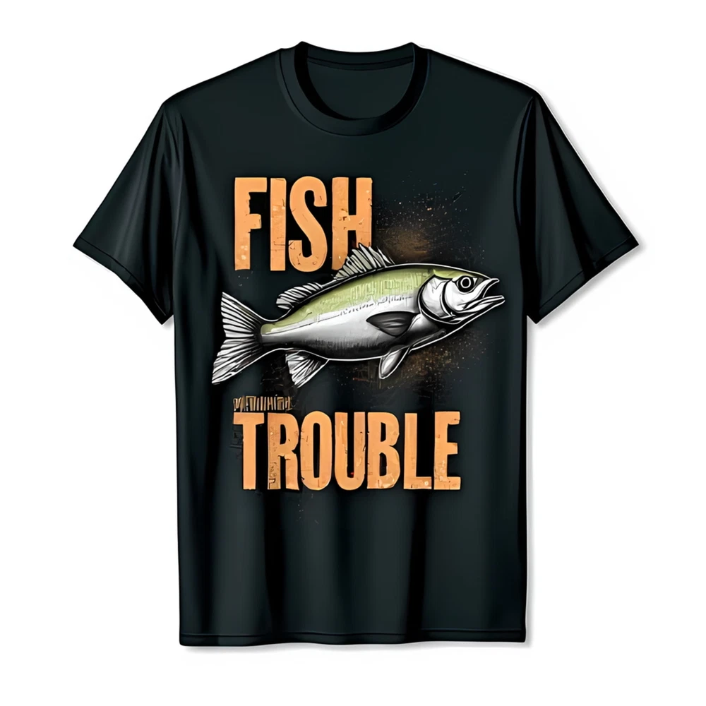 Funny T-Shirt Black FISH TROUBLE Design with Fish Graphic & Splatter