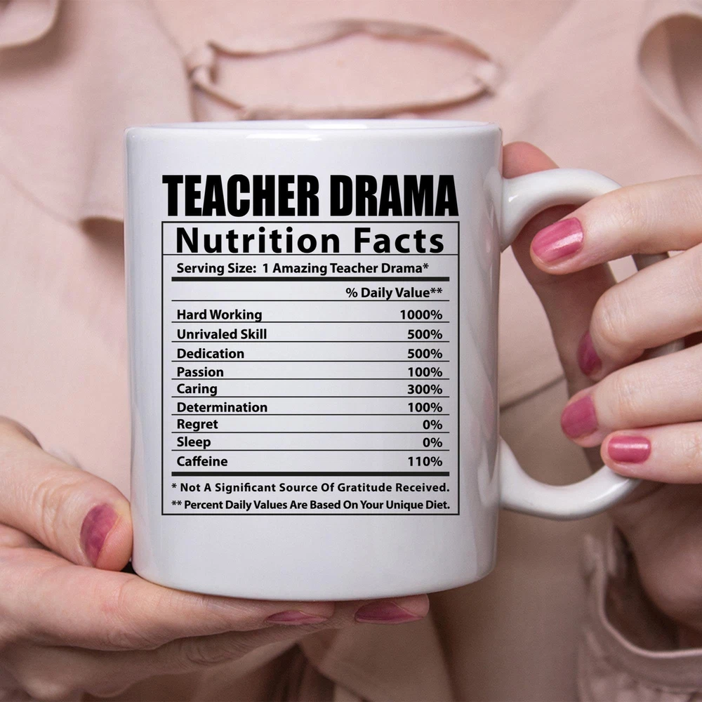 Funny Teacher Drama Nutritional Facts White Coffee Mug Product Details.. This high quality 11oz. ceramic white mug has a premium hard coat that provides crisp and vibrant color reproduction sure to last for years. Perfect for all hot & cold beverages. The highest quality printing possible is used. It will never fade no matter how many times you wash it. Material: 100% Ceramic. Print both sides. Dishwasher and Microwave Safe. High Gloss + Premium White Finish. Printed in the U.S.A. Personalized & Custom. We support personalized and custom mug to add custom, when placing an order, you can add notes to the "order note" in shipping address section. Also you can contact us directly via message. Shipping Info. Ready to ship in 1 to 2 business days, All products are made-to-order and proudly printed in the United States. Shipped by USPS and DHL, You will receive your order in 5-7 days. Replace & Refund. All products are defective during shipping broken, chipped will be replaced free of charge. You are not satisfied with the product, we will refund 100% money to you. If any other issues arise, please do not hesitate to message, we would be more than happy to assist you.