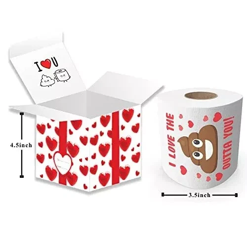 Funny Toilet Paper Roll Bathroom Gag Gift for Valentine's Birthday Anniversary Features: PACKAGE INCLUDES - Our Cute Toilet Paper Valentine's Day Novelty items include 1 Gift box and 1 roll of 200 sheets Valentine's Poop Toilet Paper with humorous Messages. " I love the poop outta you " cute messages will bring fun and cheer to your Valentine's day! UNIQUE TOILET PAPER DESIGN - Valentines Day I love you toilet paper has vibrant color designs and its dimensions 4.5"x3.5". 200 Sheets of 2 ply love tissue rolls. It's soft and ultra-absorbent. You can surprise your man with this hilarious toilet prank. It's the most funny birthday, valentines day, celebration prank that also shows how much you care! If you need creative naughty ideas to surprise your boyfriends no need to look further! GIFT BOX - Our gag gifts toilet paper comes in a unique gift box to make this gift even more special! With its special Valentine's Day themed design your significant other will love it! IDEAL GIFT - Valentines Day Romantic Novelty Toilet Paper set provides jokes, fun and entertainment for your loved ones! It’s a great cheesy gift option for Valentine’s Day, Christmas, Anniversary, Birthdays and more!