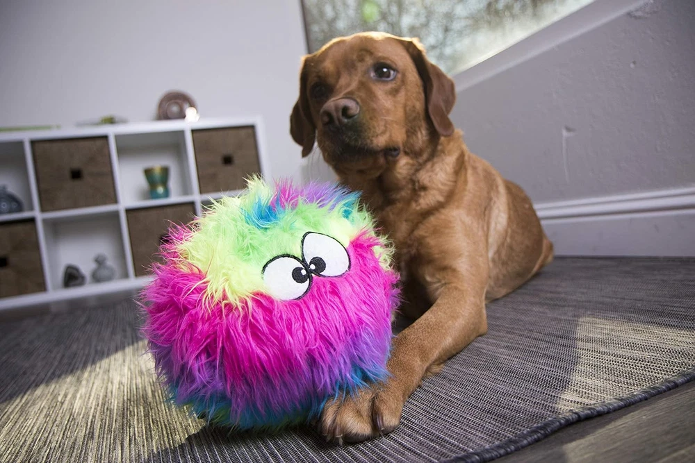 goDog Large Rainbow Furballz dog toy with Chew Guard Technology Features chew Guard Technology and double stitched seams to be tougher and last longer than standard plush toys guaranteed! Constructed of soft, fuzzy, fur dogs love goDog Furballz Squeaker Plush Dog Toys feature silly, googly eyes and bright, fun colors to attract your dog's attention. The round shape is ideal for tossing and retrieving. Features a big, loud ball-shaped squeaker that drive dogs crazy. Made with soft, fuzzy long faux fur that dogs love, and lined with Chew Guard Technology - these toys are designed to stand up to rough play. goDog plush dog toys are designed to be stronger and last longer. Made more durable with Chew Guard Technology, a special manufacturing process that adds a super tough and durable lining to soft plush toys. goDog gives pet parents the best of all worlds: innovative products, stylish designs, and exceptional value with a variety of toys and beds to meet a dog's needs for play, retreat, rest, and fun! goDog products are designed to meet child safety standards. DISCLAIMER: Our toys are tougher than standard plush toys, but NOT indestructible; some dogs can destroy Chew Guard toys depending on their play and chew patterns.