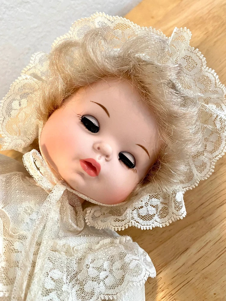 17" long - Italian Furga Made in Italy; late 50's, early 60's Marked on back of neck Original hand tag and box A rare doll in this country; sold in Europe * Poor storage has caused mold spots. * I treated the mold with chlorine and * Sprayed the doll with vinegar solution * Due to the music box, I could not wash the body. * Doll is odor free * Clothes are without spot, stain or odor Box is faded; lid has a torn corner Look at that BEAUTIFUL FACE Deep blue sleep eyes PLAYS Brahm's Lullaby while Head moves Bambola: a doll that looks real Vinyl head and arms; soft body and legs Rooted blonde hair She has sleepy blue eyes with full lashes Clothes are freshly washed Clothes are original, clean and complete Lovely Italian lace and nylon Her fingers curl She is very sweet to hold Look close, ask questions Thank you