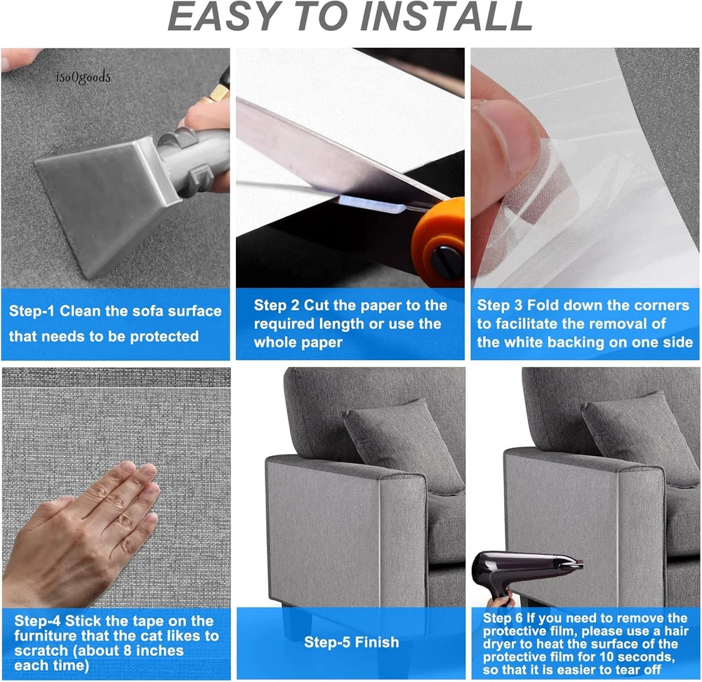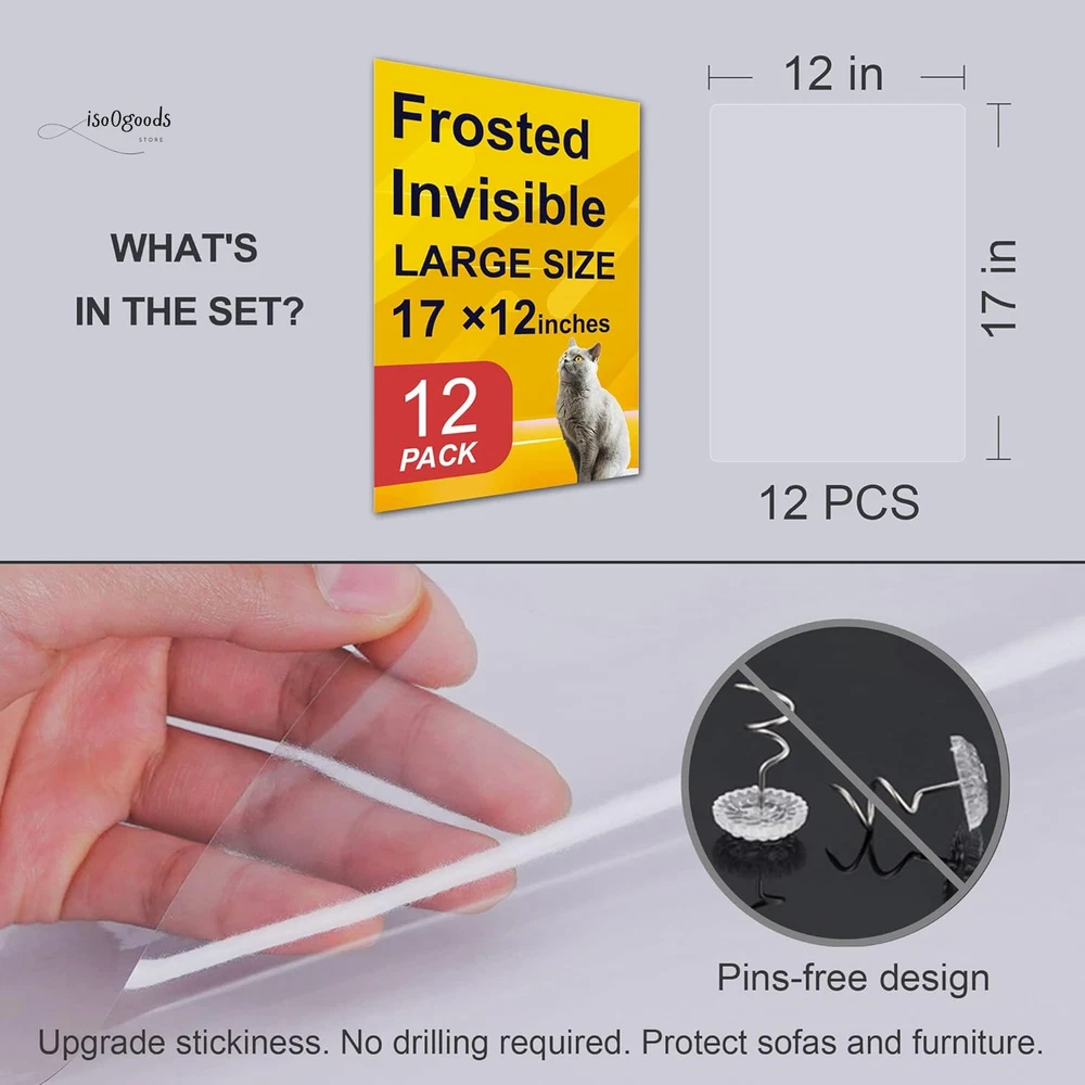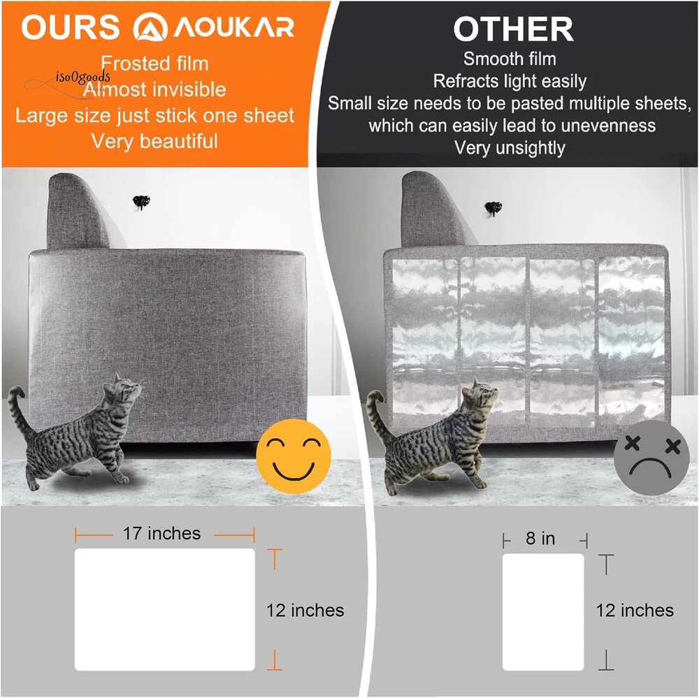 Aoukar Cat Scratch Furniture Protector - 12PCS 12" x 19" Ultra-Thin, Flexible & Durable Anti-Scratch Tape for Sofas, Chairs, and More ✨ Large Area Coverage & Customizable Fit Protect your furniture with ease! This set includes 12PCS of 12" x 19" anti-scratch cat tape, offering ample coverage to safeguard sofas, chairs, or any other furniture. The tape is easily customizable and can be cut to fit any shape or size, ensuring perfect protection for your furniture. 💪 Ultra-Thin & Transparent for Seamless Integration The 0.15mm ultra-thin frosted surface of the tape blends flawlessly into your home’s décor, providing effective protection without disrupting the aesthetic of your furniture. Unlike other products, this cat scratch guard tape will not glare under bright light, keeping your furniture looking sleek and stylish. 🔧 Easy Installation, No Tools Required Installing this cat scratch protector is a breeze! Simply peel off the self-adhesive backing, apply the tape to your desired surface, and enjoy long-lasting protection. It can be easily bent around furniture contours and is perfect for use on corners, arms, and other areas that attract your cat's claws. No complex steps or tools required —just peel and stick! 🌿 Flexible & Durable for Long-Lasting Protection Crafted from non-toxic clear vinyl , this cat furniture protector is both durable and flexible . Its robust construction prevents scratching damage while still being flexible enough to fit around the curves and edges of your furniture. Say goodbye to torn upholstery and scratched wood! 💯 Quality & Satisfaction Guaranteed We stand behind the quality of our Aoukar cat furniture protector. Your satisfaction is our priority! If you have any questions or concerns, our professional customer service team is ready to assist you. Enjoy a superior shopping experience and a product that protects both your furniture and your furry friends. Why Choose Aoukar Cat Furniture Protectors? XXL Coverage : Aoukar’s extra-large protectors cover more area, providing comprehensive protection against your cat's claws. Frosted, Non-Glare Surface : Unlike shiny protective films, our frosted material won’t reflect glare, giving your furniture a sleek, high-end look. Single-Sided Lamination : Our innovative single-sided bonding technology ensures durability without residue, avoiding the common issues of double-sided tape. Your cat will live peacefully with your furniture. No Pins, No Damage : No sharp pins to worry about! Safe for both your cat and your furniture, making it the ideal solution for cat owners. Q&A Q: Can I use this protector on any surface? Yes, this protector is safe for use on both soft fabrics (sofas, armchairs) and hard surfaces (tables, chairs, counters). For peace of mind, test a small corner before full application. Q: Is this product only for cats? While it's designed for cats, this protector can also deter small dogs from scratching furniture. Pro Tip : Place the protector where your cat scratches most and provide a scratching post nearby. Your cat will naturally choose the scratching post over the taped areas! Important Reminder : This product is not suitable for furniture that is chipped, peeling, or fading. Ensure your furniture is in good condition before applying the protector. Protect your furniture with Aoukar’s Cat Scratch Furniture Protector! Prevent damage from your pet’s claws and keep your home looking great. Order now for quick, easy installation and lasting protection!