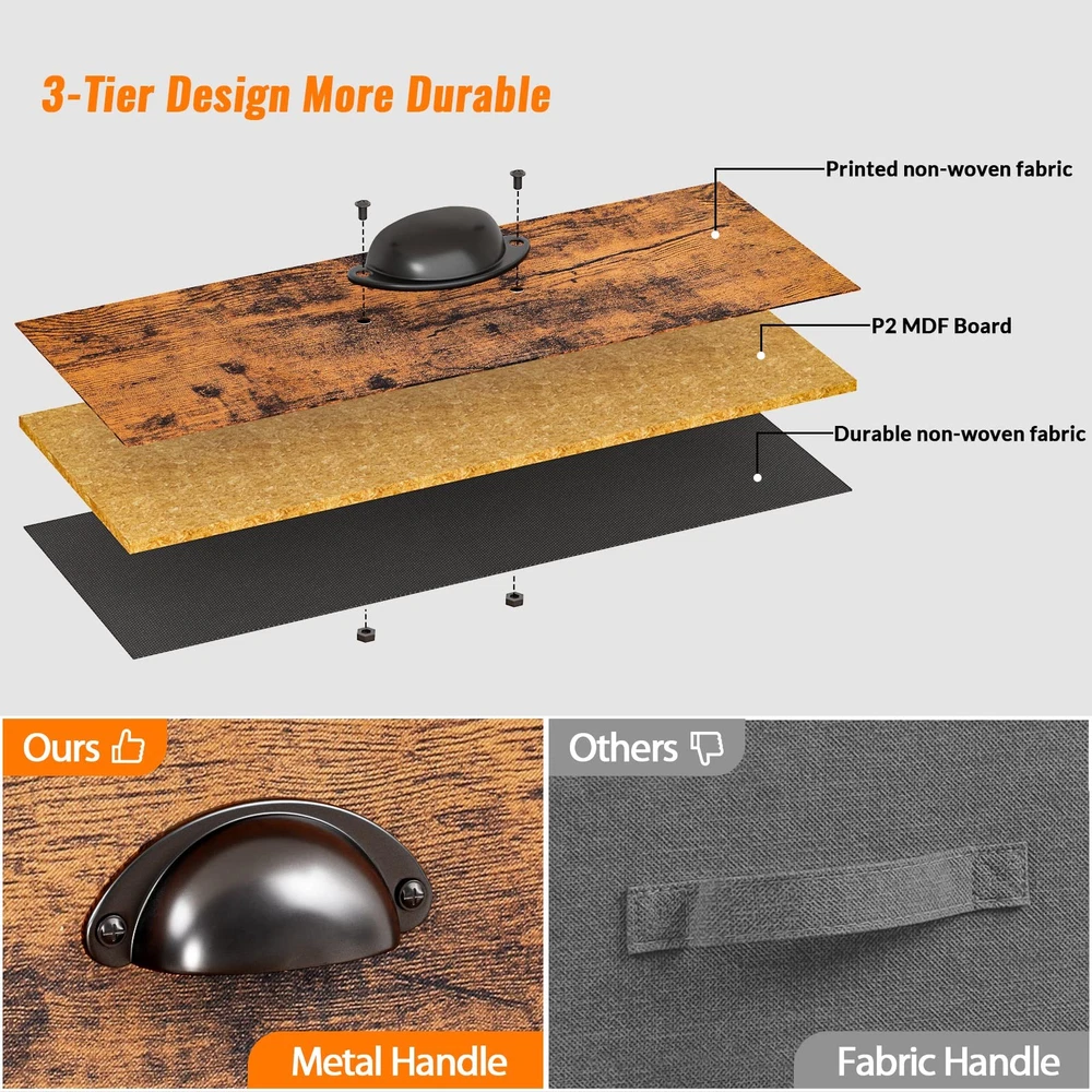 End Table with Storage Shelf and Fabric Drawer, 2 Tiers Industrial Nightstand, Retro Bedside Table Organizer, 23.6 Inch Tall Side Table for Living Room Bedroom, Rustic Brown and Black, Easy Assembly Stable and Sturdy: The bedside table features a fabric drawer with sturdy particleboard panels and steel side frames, durable and load-bearing capacity up to 44 lbs.4 adjustable feet keep the table level to avoid scratching the floor. 3-Tier Storage Option: The tall side table includes 2 tiers of open shelves provide ample space for storage and display. The open top shelf is perfect for displaying picture frames and plants. A drawer with handles provides more space to store personal items you want to put in. Multi-function Stand: You can place it in many places, such as a bedside table in your dorm room, a printer stand or a coffee table next to your sofa. Decorate your space with an industrial style nightstand. Upgraded Fabric Drawer: The metal end table features easy-pull arch handles and storage drawers made of high-quality non-woven fabric that is lightweight, breathable and prevent dust. The fabric drawer front is veneered with engineered wood in a rustic look. Pretty Easy to Assemble: Modern Bedside table overall dimension: 11.81"D x 14.96"W x 23.62"H.Manual with detailed operation instructions, the hardware and tools included and each accessory is labeled for easy installation. We provides customer service before and after purchase. If you have any questions, please feel free to contact us.