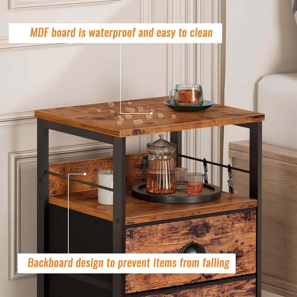 Furologee Nightstands Set 2, Bedside Table with 2 Fabric Rustic Brown Product Details Brand: Furologee Product Dimensions: 11"D x 14.96"W x 23.62"H Color: Rustic Brown Product Care Instructions: Wipe with Damp Cloth Table design: Nightstand Item WeightFrame Material: 8.77 KilogramsEngineered Wood, Metal Top Material TypeShape: Engineered WoodRectangular Product Size:14.96"D x 11"W x 23.6"H. End Table with 2 Hooks: Equipped with 2 S-shaped metal hooks to add extra storage space. You can hang headphones, file folders, keys, small backpacks, hats and so on. Removable hooks can be hung on the side table or in other place. 2 Fabric Drawers: The night stand have 2 fabric drawers, breathable and prevent dust, make table is lightweight. Sealed drawers for storing snacks, toys and other everyday items. It is ideal for storing personal items. Drawers bottom hold up to 7 lbs. Sturdy & Stable: Exquisite particle board and metal frame combination, and 2 metal rods on the side not only hang hooks, but also increase the sturdiness of the nightstand. 4 adjustable foot keep table stable and protect the floor. Beautiful particle board table top is simple and waterproof, wipe gently with a damp cloth and say goodbye to stains! Ample Storage Space: The bedside table has a top shelf, open storage space and 2 large drawers. 2 tiers shelf provide ample space for phone, alarm clock, lamp, book, and coffee mug. Keep your room organized. Decorate Your Room: Warm and retro night stands, can be used as a living room sofa side table, bedside table for bedroom, printer stand for study, hallway storage table. In addition, perfect combination with Furologee computer desk, TV stand, sofa table and bookshelf. Worry-Free Service: The manual with detailed operation instructions, the hardware and tools included and each accessory is labeled for easy installation. If you have any questions, please feel free to contact us.