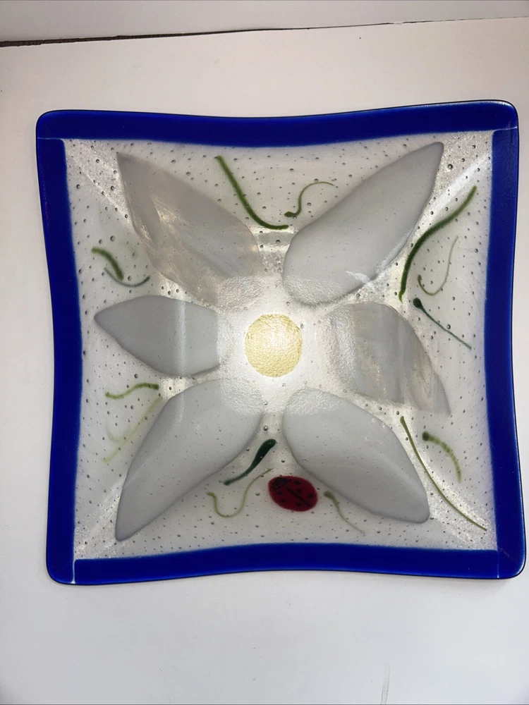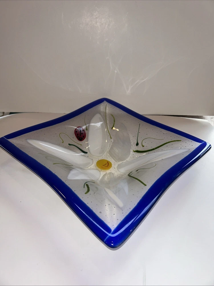 This is a beautifully crafted fused glass platter, plate, and bowl set in a vibrant multicolor art floral design. The 12-inch square piece features a charming daisy and ladybug motif, making it a delightful addition to any dining or display collection. The unmarked brand adds a touch of mystery and uniqueness to this decorative cookware piece, perfect for adding a pop of color and artistry to your home.kk405. 2.5 “ tall