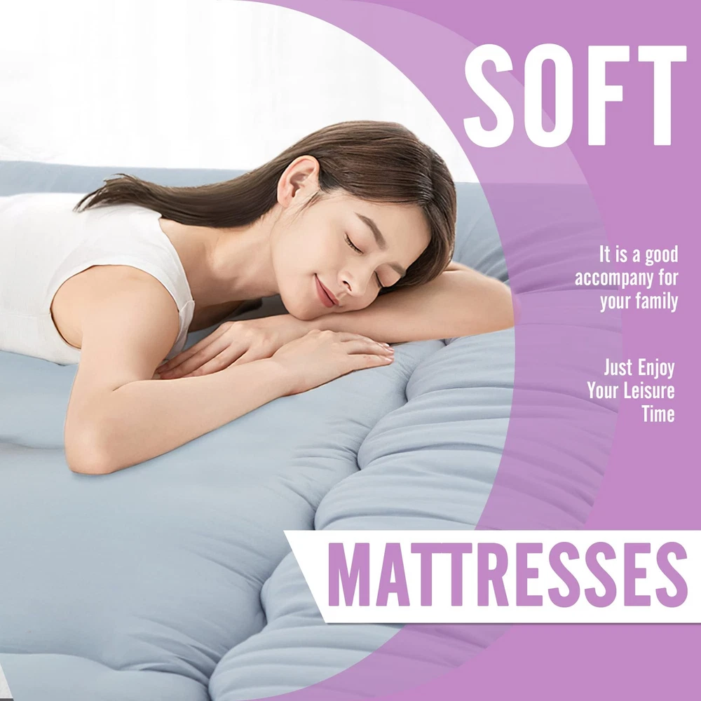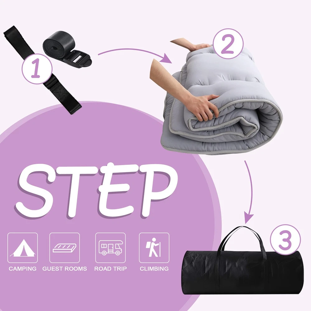 【 JAPANESE MATTRESS】Queen Size:80"x60" x 4".Floor Mattress fits the structure of your body, providing you with comfortable sleep and relief from fatigue. 【EXCELLENT 5-LAYER MATERIAL STRUCTURE】Skin-Friendly Microfiber Fabric + Polyester Padding + High-Density Support Foam + Polyester Padding + Skin-Friendly Microfiber Fabric.Superior skin friendly material to give you a comfortable sleep experience. 【WARM REMINDER】Since the Japanese Floor Mattress is compressed, please take it out and put it in a ventilated place before use. It will take at least 2-3 days to restore the mattress to its original shape. A dab in the sun will speed up its recovery. Regularly patting the mattress in the sun will keep Mattress Pad fluffy. 【MULTI-SCENARIO APPLICATION】The Floor Mattress is very versatile. You can put it in the bedroom, living room, tatami mat, guest room, children's toy room, etc., can also carry with the car, is your camping when a good helper. 【EASY TO STORE AND SAVE SPACE】Set includes: 1 Mattress, 1 Mattress Cover, 2 Bandages, 1 Storage Bag.Detachable mattress covers keep dust out, and 2 Bandages help you easily fold your mattress into your Storage Bag. Easy to carry and store.