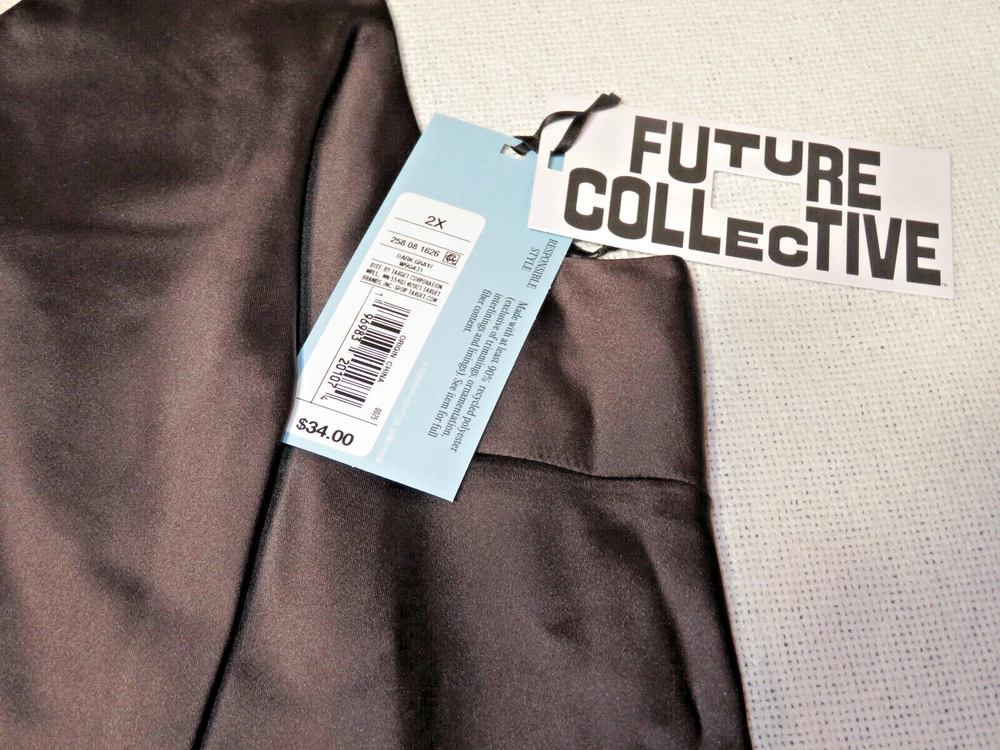This stunning Future Collective evening gown is perfect for any formal occasion. The dress features a round neckline and strappy sleeves, with a pullover closure for easy wear. The satin fabric gives the dress a luxurious look and feel, while the lined interior ensures comfort all night long. The dress is a size 1X and fits a plus size women's department. It's machine washable for easy care, and the gray color and solid pattern make it a timeless piece for any wardrobe. Whether you're attending a wedding, holy communion, party/cocktail, or formal event, this dress is sure to turn heads.