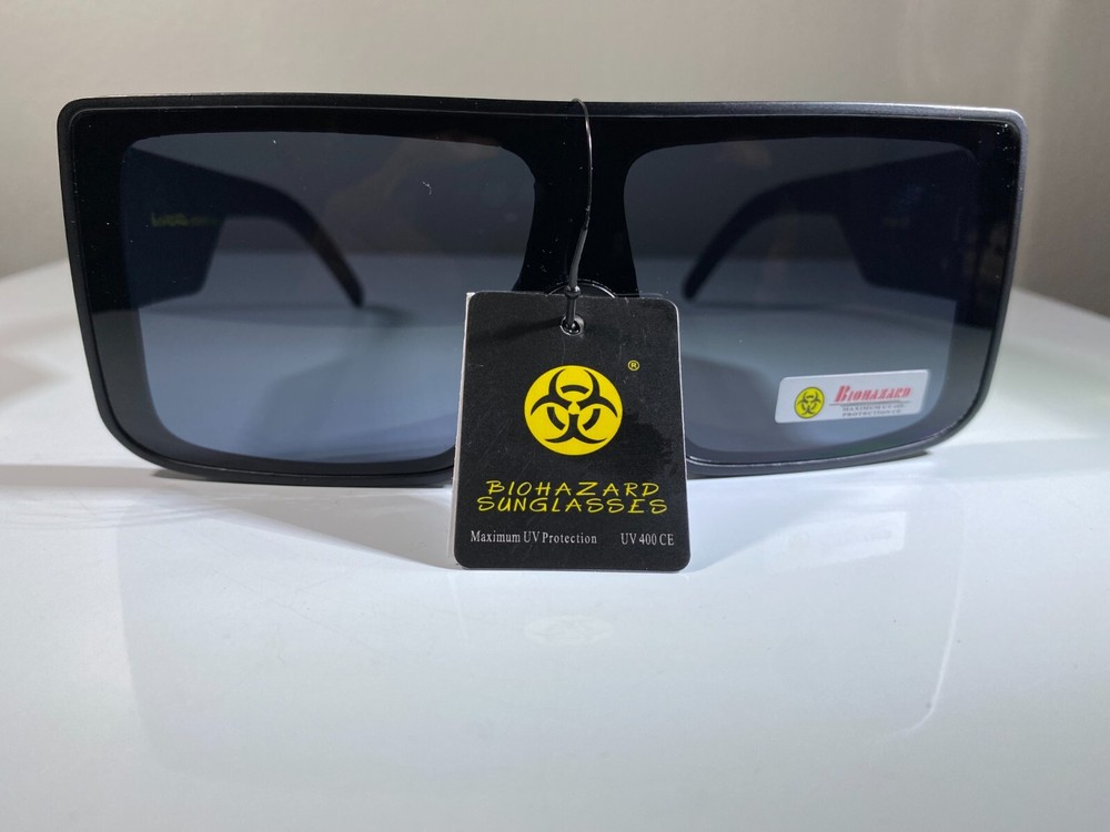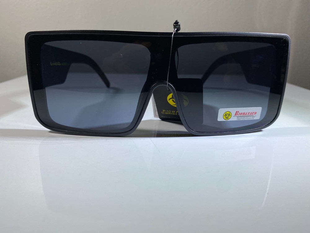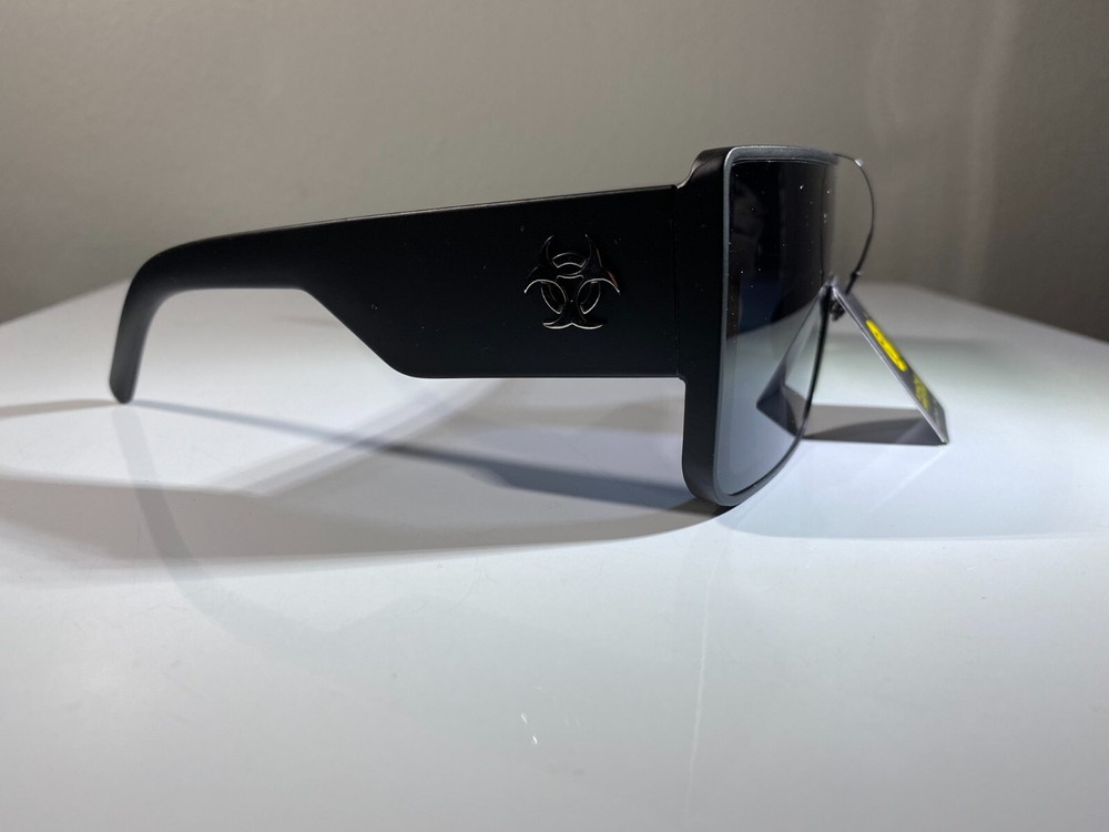 Unisex futuristic style sunglasses with black frame and smoke black lenses. Unique style at great price.