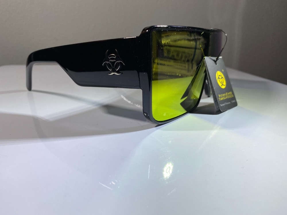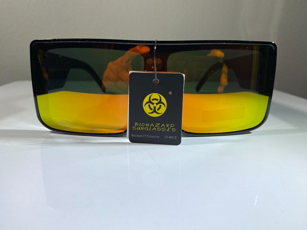 Unisex futuristic style sunglasses with black frame and yellow reflective lenses. Unique style at great price.