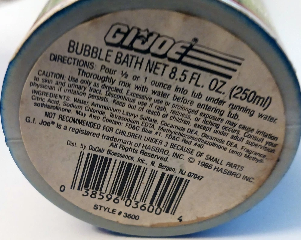 UPC:038596036004Release Year:1986Vintage:YesType:Bubble BathBrand:Hasbor/Ducairgtin13:038596036004Seller Notes:“Unopened, examine photos for closer look at condition”Franchise:G.I. Joe