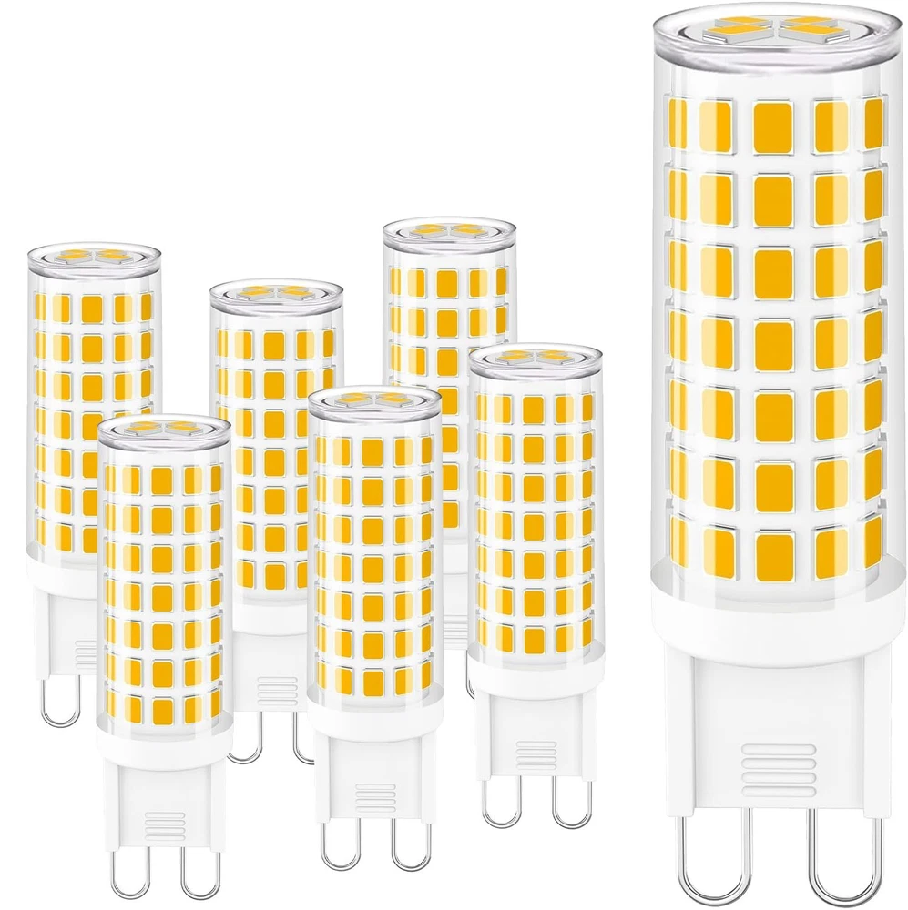 ✪ Feature -This 6w G9 led bulb can be your best choice to replace the 60W traditional halogen bulbs. -88 pcs energy-saving led chip provide refreshing bright daylight and save your electrical bill. -Fireproof ceramic material ensures better heat dissipation effect and offer longer lifespan. -Standard Bi-pin solid metal plate contact G9 base. Perfect for crystal chandelier, pendant, etc. -Relaxed yourself by 3000K cozy light. No UV or IR radiation, no visible flicker, no buzz or flash. -Transparent plastic cover allow the G9 bulb to provide 360-degree well-balanced illumination. ✪ Specification -Type: G9 Led bulb -CRI: 80+ -Power: 6W -Dimmable: No -Voltage: AC 120V -Luminous Flux: 5500LM -LED Type: 88pcs 2835SMD -Halogens Equivalent: 60W -Color: Warm White 3000K -Material: Plastic and Ceramic -Size: 0.73x0.73x2.5 inches -Beam Angle: 360-degree -Lifespan: 30000 hours ✪ Warranty & Package -24-month warranty -Package: 6psc 6W G9 LED Light Bulbs (3000K Warm White) 📣 Warning 1. The G9 LED bulbs are Non-Dimmable. 2. Make sure the size is suitable before purchase. 3. Please turn off the power before installation. 4. Keep away from any source of heat or water. Better Than Halogen: Featuring 88 2835SMD LED chips, this 6-watt G9 LED bulb is a smart choice for reducing your electricity bill.Note: G9 LED bulbs are longer than halogen bulbs. To ensure fitment, please check the size before purchase. 3000k Warm White: This G9 LED bulb emits a soft and cozy light to protect your eyes. It creates a comfortable atmosphere to make you feel relax and reduce the mental stress from work or study. Standard bi-pin G9 base, ideal for crystal chandelier, pendant, wall sconce, table lamp, office, hotel and other indoor applications. 360 Degrees Lighting: High transparent cylinder-shaped plastic cover allow the bulb light up from every surface to give you a uniform 360-degree illumination without dead angle that can never achieve from halogens. Fireproof Ceramic Body: This G9 LED bulb with ceramic body not only safe and fireproof, but also has excellent heat dissipation performance to extend its lifespan. (30000hours lifespan) Safe LED Bulb for Home: These LED light bulbs have obtained ETL, CE, FCC, and RoHS certifications, meeting the product safety standards. This means that they are safe to be used in the bedrooms, living rooms, or dining room.