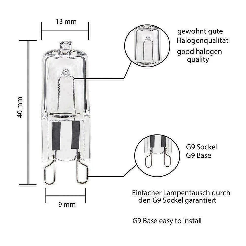 Description Description&Preview shipping&policy Description: Product Description: 1. Product name: halogen lamp beads G9 220V 2. Lamp holder model: G9. 3. Wattage: 40w 4. Product color: transparent 5. The outer diameter of the glass bulb: 13 (mm) 6. The voltage is 110-130, 220-240V 7. Power: 20-75W 8. Life: 1500-2000H Preview: Thank you for your purchase Problems? You can follow below process to chontact us. There is a time zone difference,but we will do our best to quickly response to your questions: Shipping ● We will arrange shipping for you within 24 Hours after payment cleared except the holidays. ● We always send the item to the address you give us on PAYPAL to ensure the security of the item. If you have changed your address, or want us to ship to another address, please change to the new address when you pay us with PAYPAL, otherwise we will not be responsible if the package is lost. Payments We accepts Paypal only If you have any questions about the payment,please contact us through eBay message. Import Duties In case some duty is due Upon delivery, it is your responsibility to meet that expense and this may cause delays to delivery schedule and you may have to pickup goods at the customs office. Terms & Conditions By bidding on this item,the Buyer agrees to all of the terms and conditions as outlined in this listing .please ensure to read and agree to All eBay terms and Conditions before bidding. All pictures are for illustration purpose only and Colours may vary slightly. Our store obeys all eBay Rules and Policies. Returns Policy To Return an item you must contact us and take photos of your item to clearly show any damage or unusual aspects of it. Approved returns will be subject to inspection on arrival. Items must be returned in original condition with all original packaging. All shipping and handing charges are non-refundable Return delivery costs are the responsibility of the buyer. We will cover the cost if sending replacement/repaired items. Within 7 days after receiving your products, we offers a no-hassle 7 day exchange/replace only if your items are found to be defective by manufacturer.
