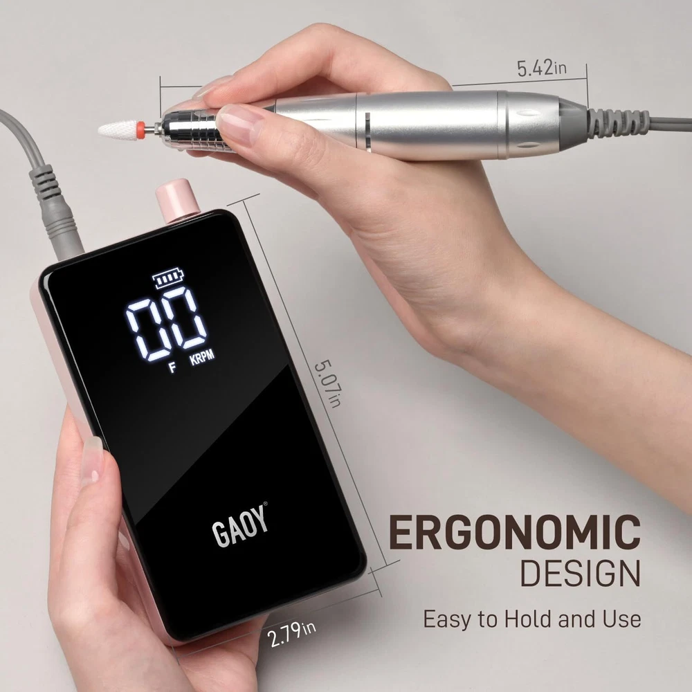 GAOY Cordless Nail Drill, Rechargeable E-File with 12 Drill Bits & 45 Sanding Bands, Long Battery Life, Low Noise, Perfect for Manicure & Pedicure, Pink Product Details Package Dimensions : 10.51 x 7.83 x 2.24 inches; 1.23 Pounds Item model number : DMJ042 Manufacturer : GAOY Cosmetics Inc. Country of Origin : China Brand: GAOY Material: Metal Model Name: DMJ042 Power Source: Battery Powered Maximum Rotational Speed: 2E+4 RPM Long-Lasting Battery Life: Enjoy extended usage with a powerful battery, allowing you to complete multiple sessions without frequent recharging. User-Friendly Design: Lightweight and comfortable to hold, our E-file is designed for ease of use. The intuitive speed display and simple controls let you adjust settings quickly, making your nail care routine seamless. Low Noise and Vibration: Engineered with premium bearings and a low-heat motor, this nail drill operates quietly and smoothly, providing a comfortable user experience. Versatile and Efficient: Capable of reaching up to 20,000 RPM, is perfect for both professional and home use. It accommodates standard drill bits and is suitable for both manicures and pedicures. Comprehensive Accessory Set: The nail drill comes equipped with 12 drill bits and 45 sanding bands.