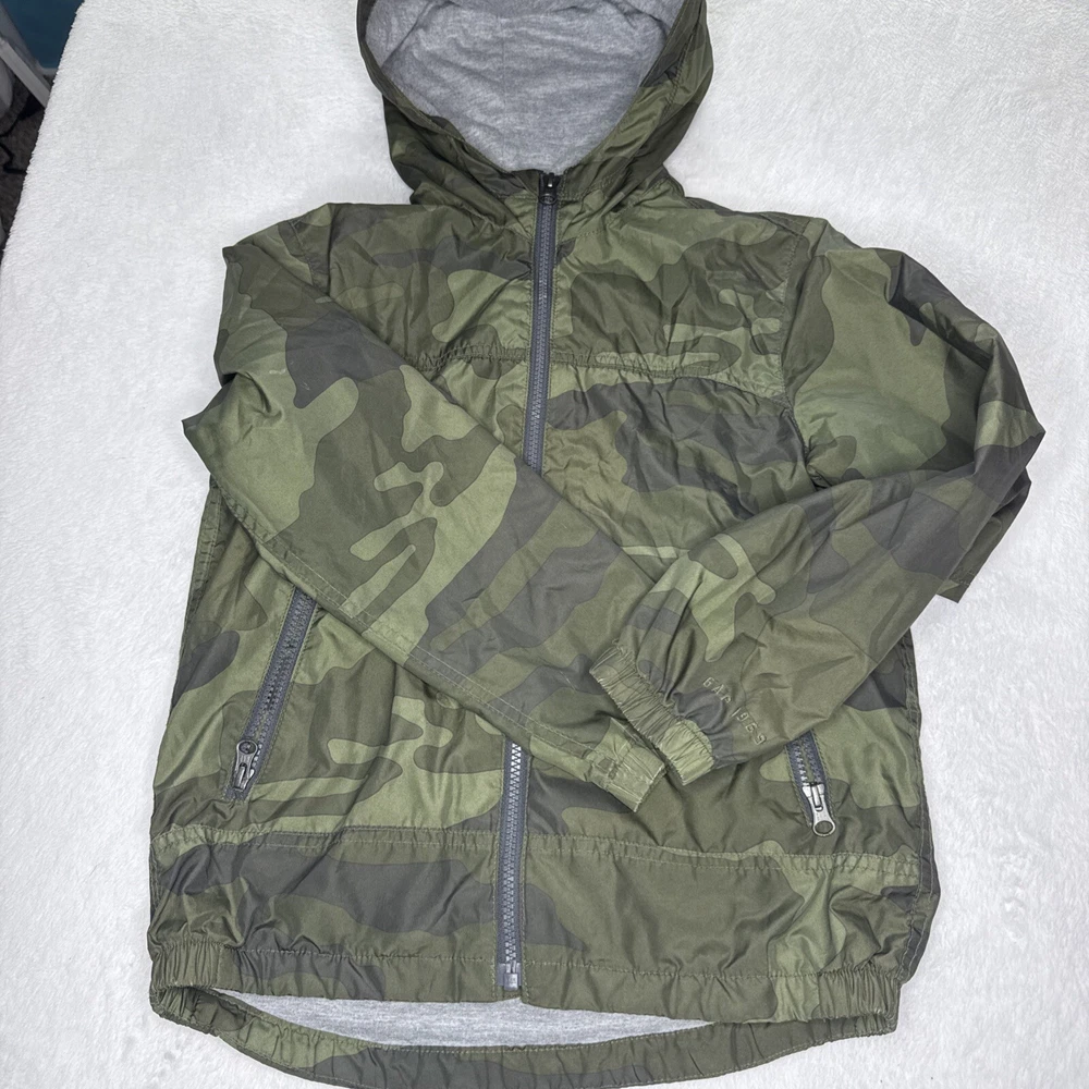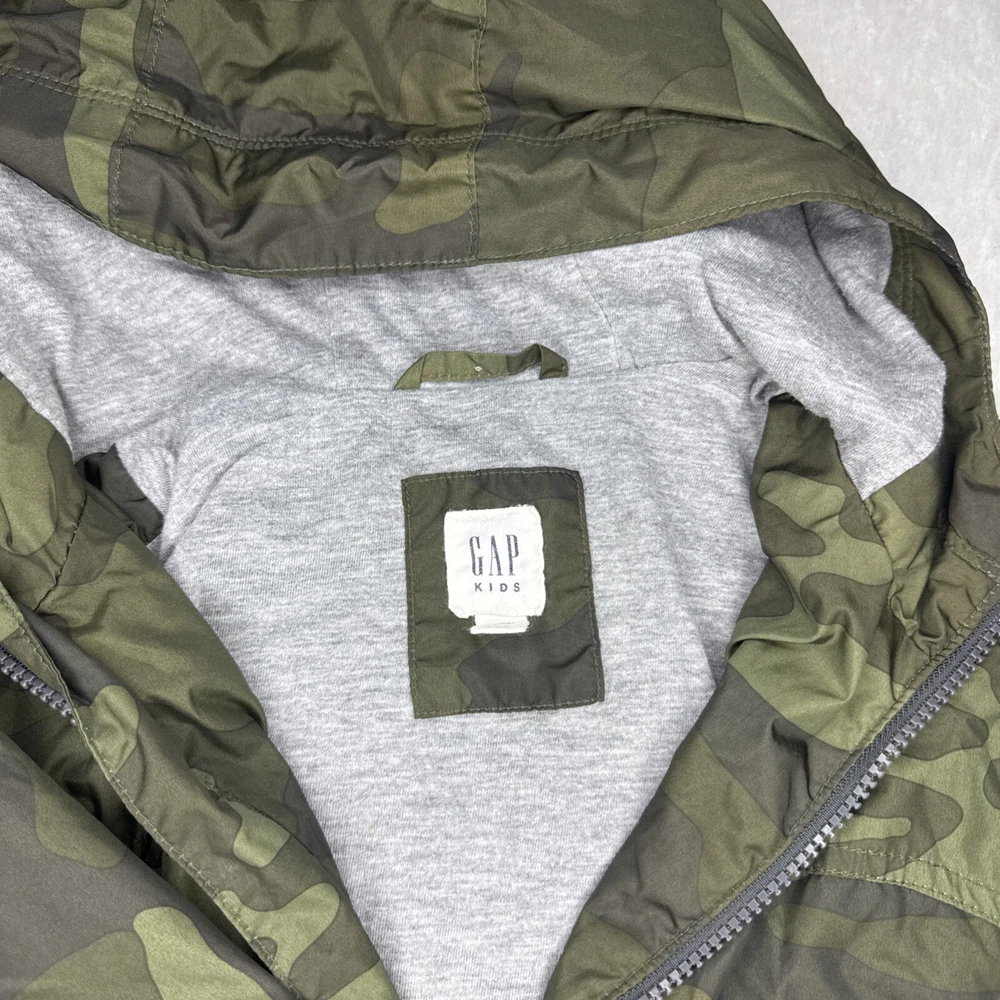 This Gap Kids parka is perfect for any active or casual occasion. The green camouflage pattern, accented with the Gap logo, adds a stylish touch to this windbreaker jacket. Made with a blend of polyester and cotton, the jacket features a hood, elastic cuffs, and hem for added comfort and protection against the elements. The jacket is machine washable and has a zip closure. It is available in size M, with a chest size of 36 inches, making it suitable for boys and youth. This jacket is ideal for summer, fall, and spring seasons.