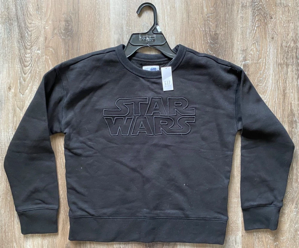 GAP KIDS STAR WARS~NEW~Black Star Wars Long Sleeve Sweatshirt~LARGE/10~NWT Boy's GAP KIDS Star Wars long sleeve sweatshirt *Retail price was $39.95 *Size: LARGE/10 *Fabric content: 77% cotton/23% polyester *Color: Black *Chest measurement: 19 inches from underarm to underarm at side seams laying flat *Length: 20 1/2 inches from top of shoulder to hem *Sleeve length: 19 inches from the top of shoulder at the seam to hem (may be 3/4 length???) *Condition: excellent, NEW condition with retail tag attached We have a smoke-free home.