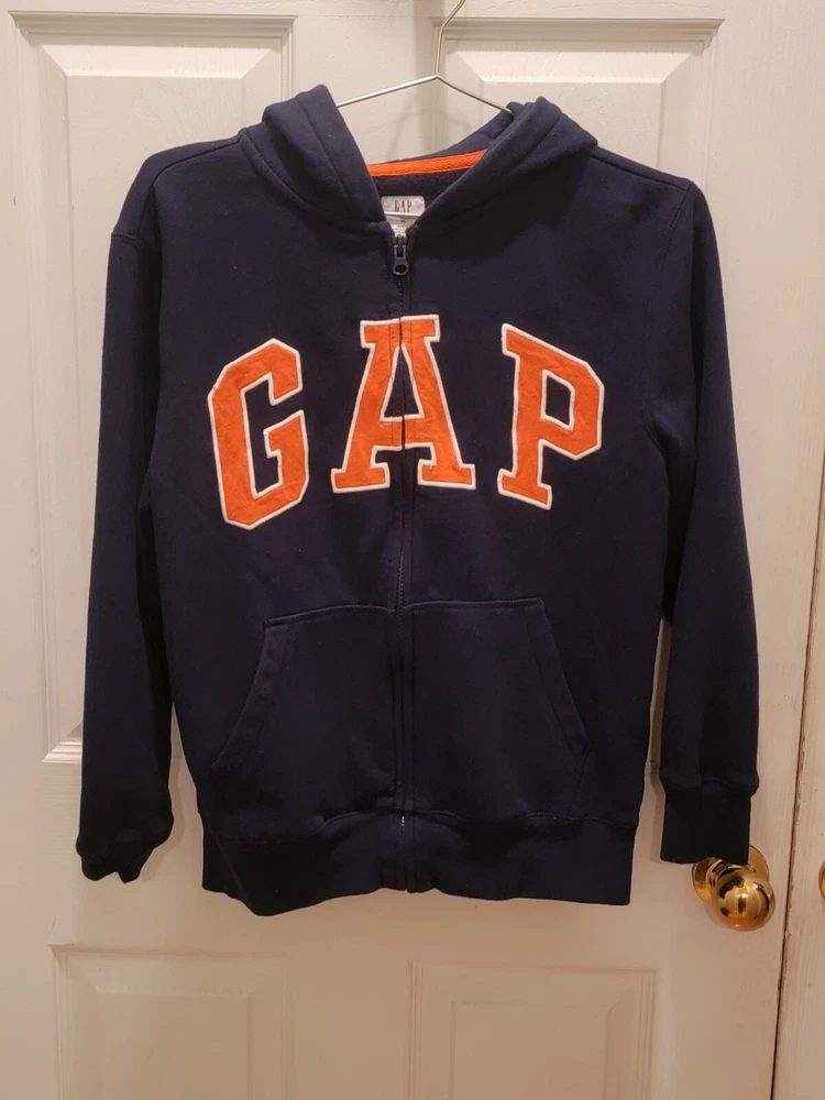 GAP Kids Navy Blue & Orange Boys Sweatsuit with Logo Zip Up Hoodie - Size XL Description: Brand: GAP Kids Type: Sweatsuit Size: Youth XL Gender: Boys Color/Pattern: Navy Blue with Orange Font Material: 100% cotton Condition: Excellent Used Condition Features: Orange GAP name across the chest on the zip up jacket. White embroidered GAP name on pants. *See pics for details* Additional Notes: Smoke-free, pet-free home Machine washable Ready to ship, fast delivery