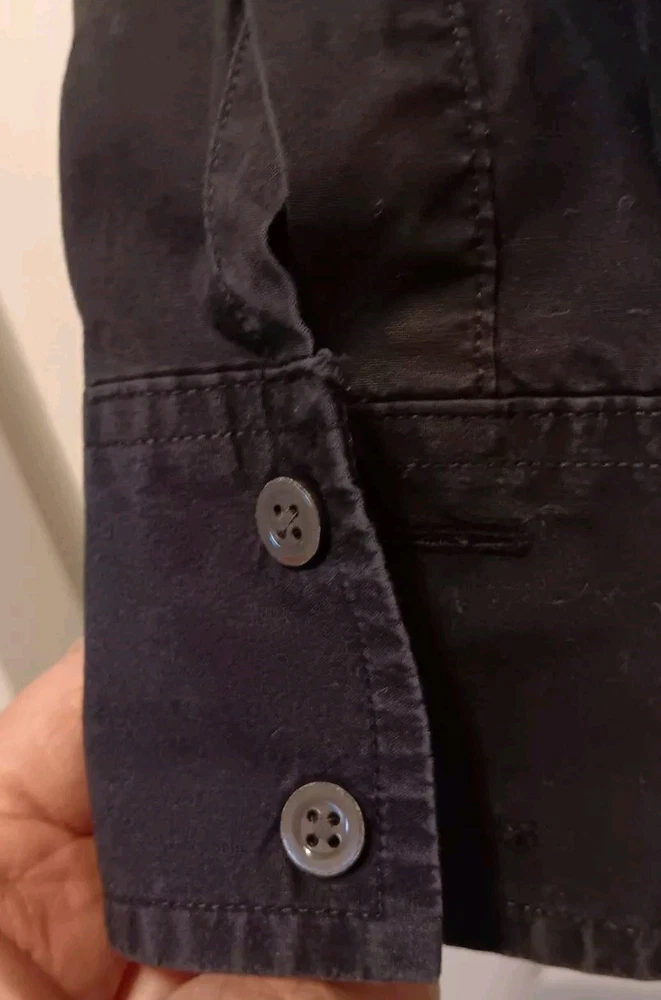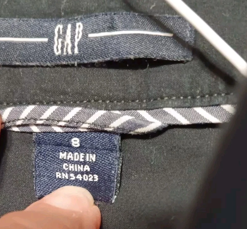 This is a GAP button-up shirt, Size 8 for women. Black, 94% cotton, 6 % lastol for stretch. No tears or missing buttons. Pit-to-pit measures 19 inches. Preowned but in good condition. See photos. Machine washable cold. Fast shipping by USPS Ground Advantage, same or next business day after purchase.