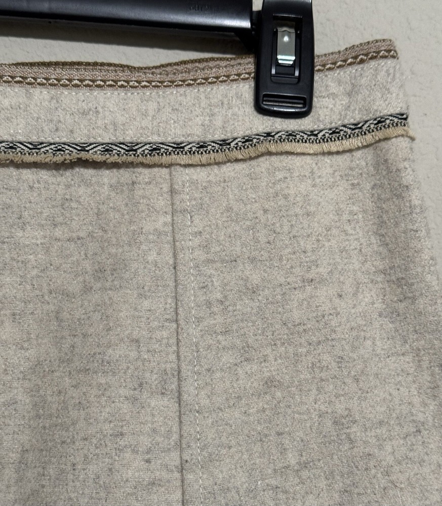 This vintage GAP wool midi skirt in oatmeal features a waist with short fringe detail. Ideal for various occasions like travel, parties, work, and business. The A-line skirt has an Aztec, and Southwestern theme with a high rise and wool fabric. It is size 6 and adorned with fringe accents, suitable for fall and winter seasons.