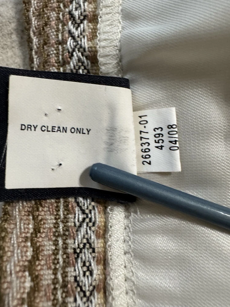 Arrived quickly. Wrapped in paper in plastic mailer but both mailer and paper were cut/ripped, thankfully pants were NOT cut or damaged from shipping. Item described as excellent condition, but my fault that I did not look at pics on laptop to see fraying on hems of pants & thought that I had read description but missed the noted fraying. Not sure how frayed hems are excellent condition?