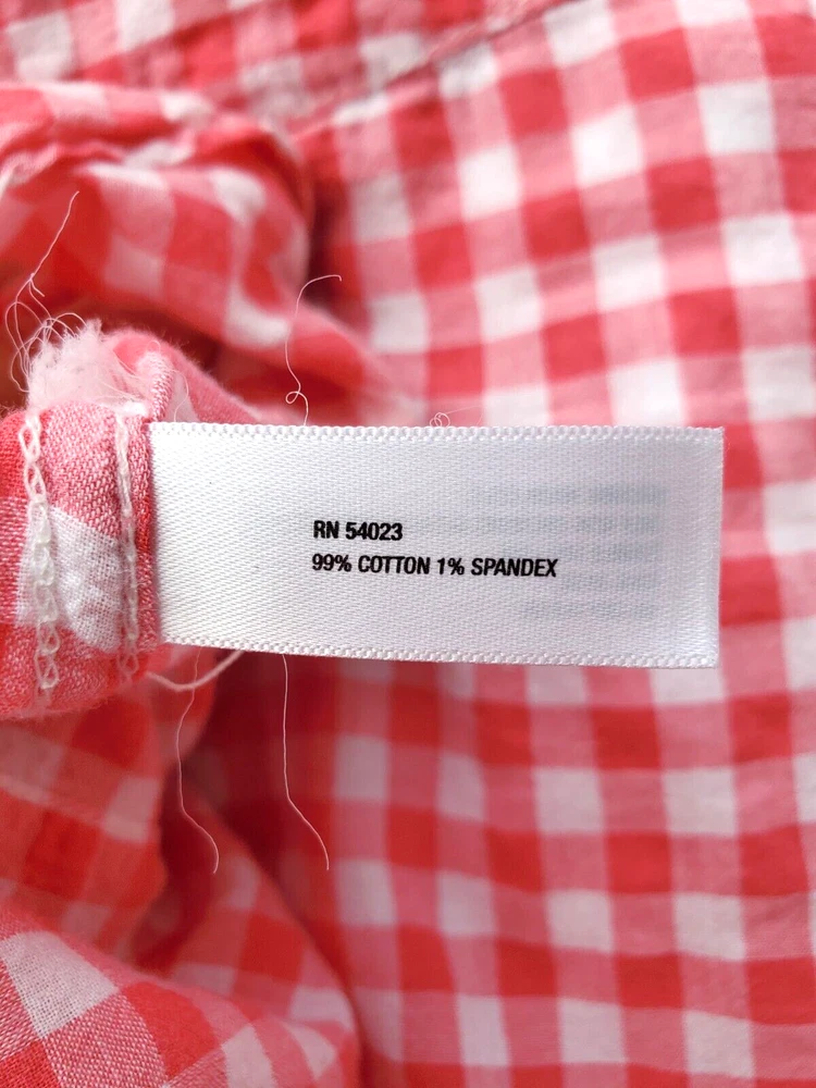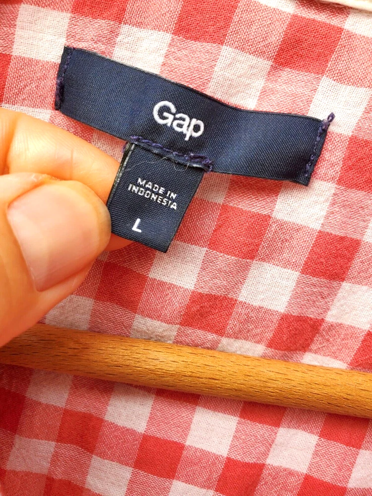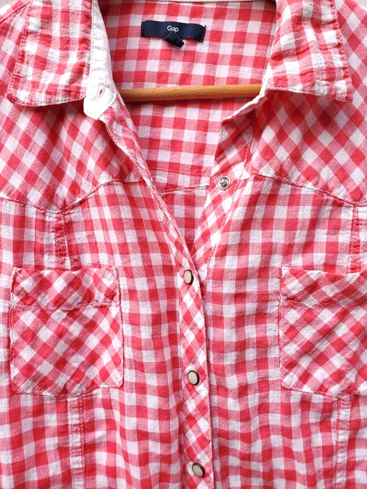 Excellent condition blouse from GAP The 99% cotton and 1% spandex fabric is pink and white checked Nice drape to the fabric, long sleeves, snapped front with two chest pockets. Size large with arm pit to arm pit of 22 ", sh oulder to hem 28", shoulder seam to wrist is 25". Posted with eBay Mobile