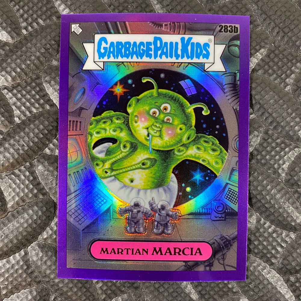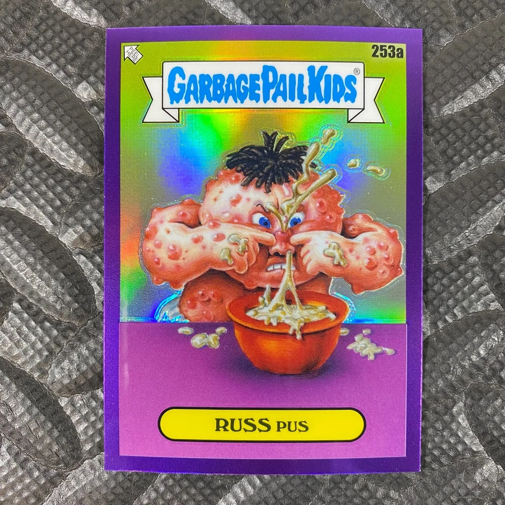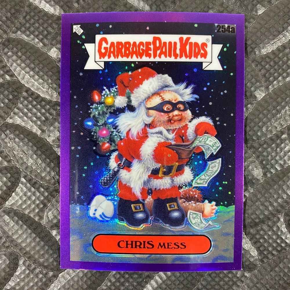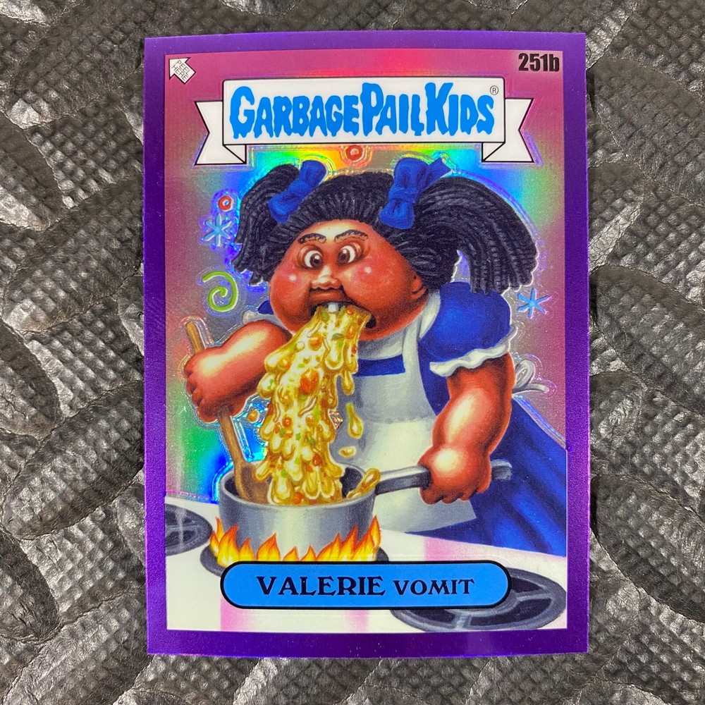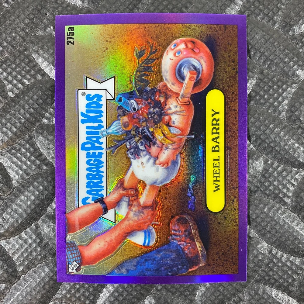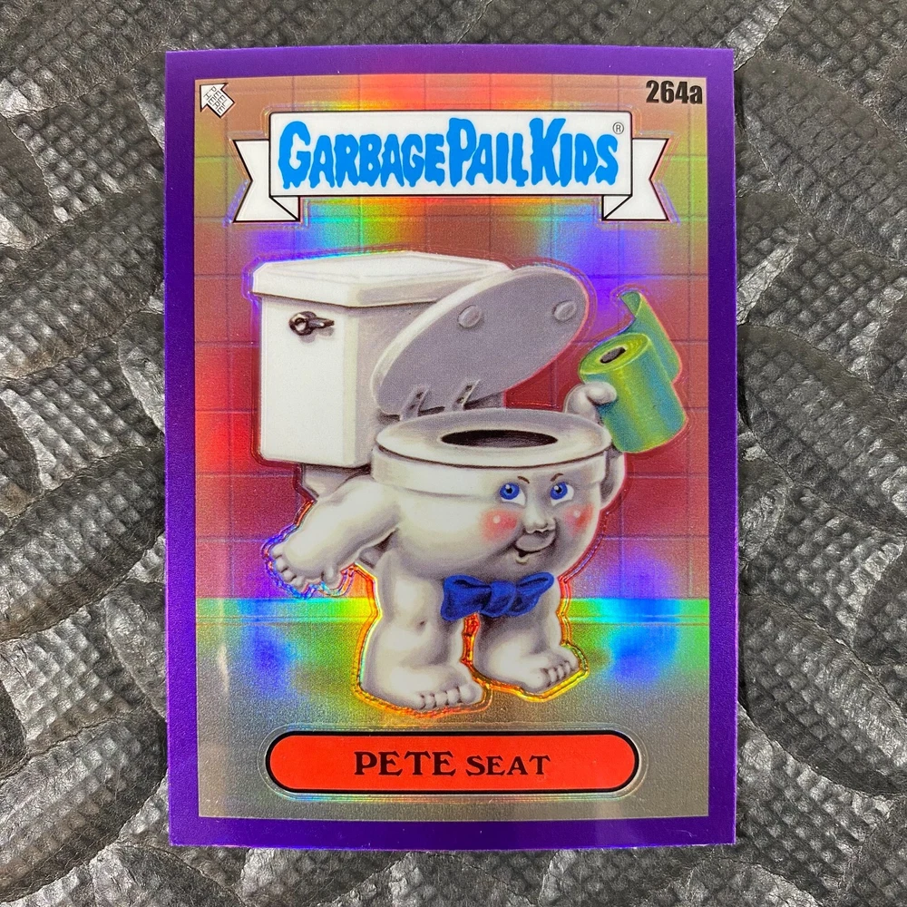This listing is for your choice of any available 2025 Topps Garbage Pail Kids "Chrome 7" Purple Refractor card from the drop-down menu above. Check out my other listings for more single parallels from this same set. Any questions? Please ask before buying. As with all of my "pick-a-card" listings, I will be shipping with "eBay Standard Envelope". The rules of this envelope state that it cannot be too thick, so please expect your order to be packaged as follows: 1 to 6 cards will be slid into a single sleeve, the sleeve will then be slid inside of a semi-rigid Card-Saver. 7 to 12 cards will be slid into a double sleeve, 13 to 18 cards into a triple sleeve, 19 to 24 cards into a quadruple sleeve(up to six cards per sleeve). The double, triple and quadruple sleeve shipping will not have the Card-Saver. If you buy more than 1 card and want it packaged with more than 1 Card-Saver(or 1 sleeve per card), I kindly ask that you contact me before purchasing to be sure that this is possible to have it done with the stated shipping charge, or if additional shipping would be required. If you do not contact me, then you can expect to receive your order packaged as I have explained here. Please do not expect rigid top-loaders to be included, I don't normally keep a lot of them in stock, but if you message me prior to ordering I will be able to see if I have any that can be included with your order - additional shipping may be required. In order to get free combined shipping from this and any of my other "pick-a-card" listings, you must add all of your cards to the cart and check out when you are done shopping. If you do not use the cart you will be overpaying on shipping and I cannot refund you on over-payed shipping. So please use the cart and get your FREE COMBINED SHIPPING!