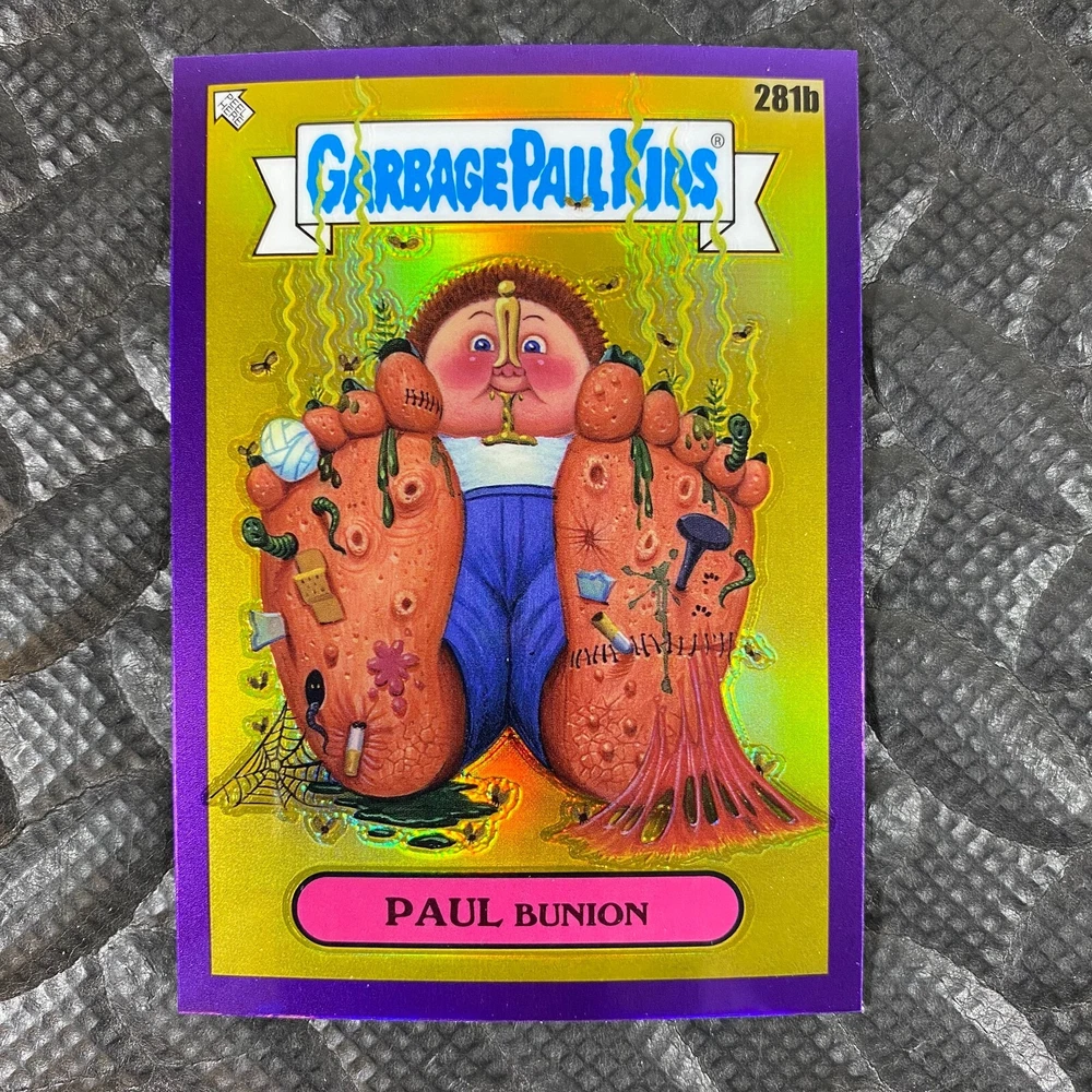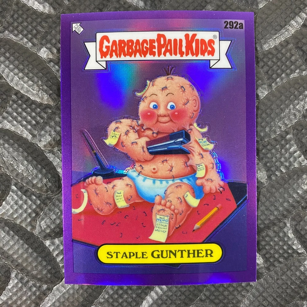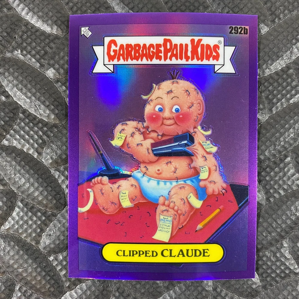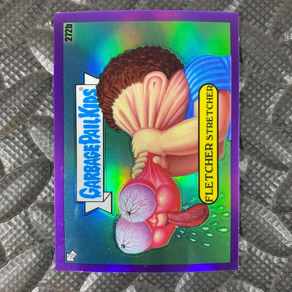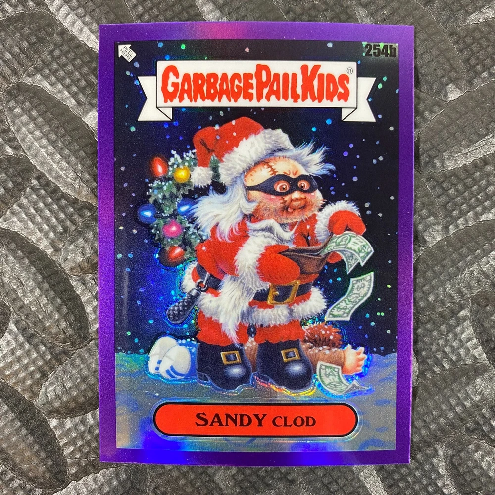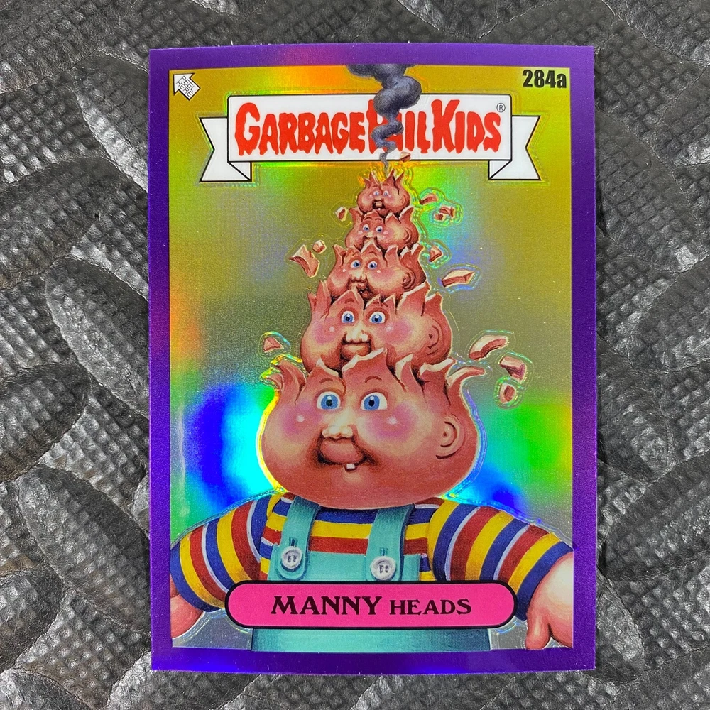 This listing is for your choice of any available 2025 Topps Garbage Pail Kids "Chrome 7" Purple Refractor card from the drop-down menu above. Check out my other listings for more single parallels from this same set. Any questions? Please ask before buying. As with all of my "pick-a-card" listings, I will be shipping with "eBay Standard Envelope". The rules of this envelope state that it cannot be too thick, so please expect your order to be packaged as follows: 1 to 6 cards will be slid into a single sleeve, the sleeve will then be slid inside of a semi-rigid Card-Saver. 7 to 12 cards will be slid into a double sleeve, 13 to 18 cards into a triple sleeve, 19 to 24 cards into a quadruple sleeve(up to six cards per sleeve). The double, triple and quadruple sleeve shipping will not have the Card-Saver. If you buy more than 1 card and want it packaged with more than 1 Card-Saver(or 1 sleeve per card), I kindly ask that you contact me before purchasing to be sure that this is possible to have it done with the stated shipping charge, or if additional shipping would be required. If you do not contact me, then you can expect to receive your order packaged as I have explained here. Please do not expect rigid top-loaders to be included, I don't normally keep a lot of them in stock, but if you message me prior to ordering I will be able to see if I have any that can be included with your order - additional shipping may be required. In order to get free combined shipping from this and any of my other "pick-a-card" listings, you must add all of your cards to the cart and check out when you are done shopping. If you do not use the cart you will be overpaying on shipping and I cannot refund you on over-payed shipping. So please use the cart and get your FREE COMBINED SHIPPING!