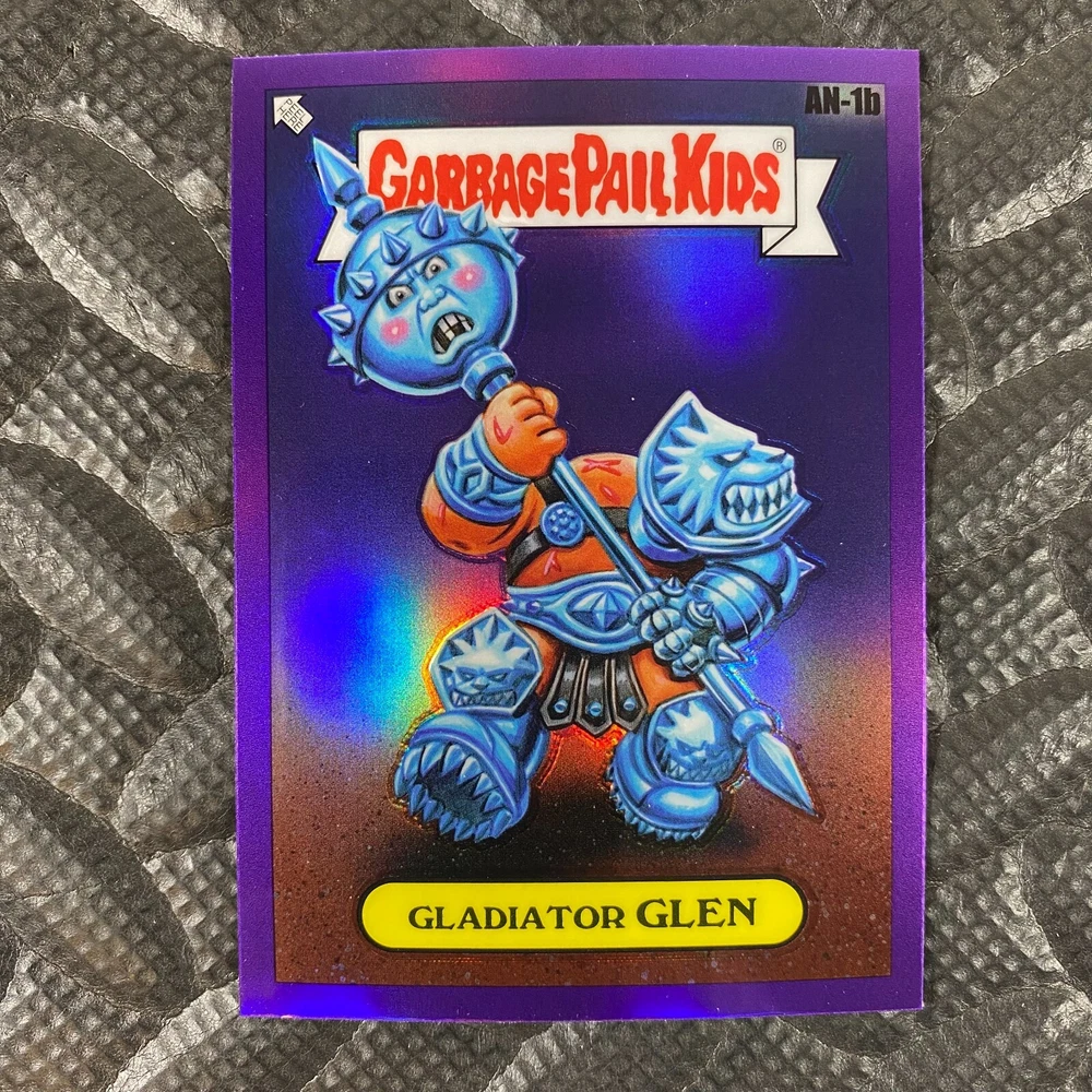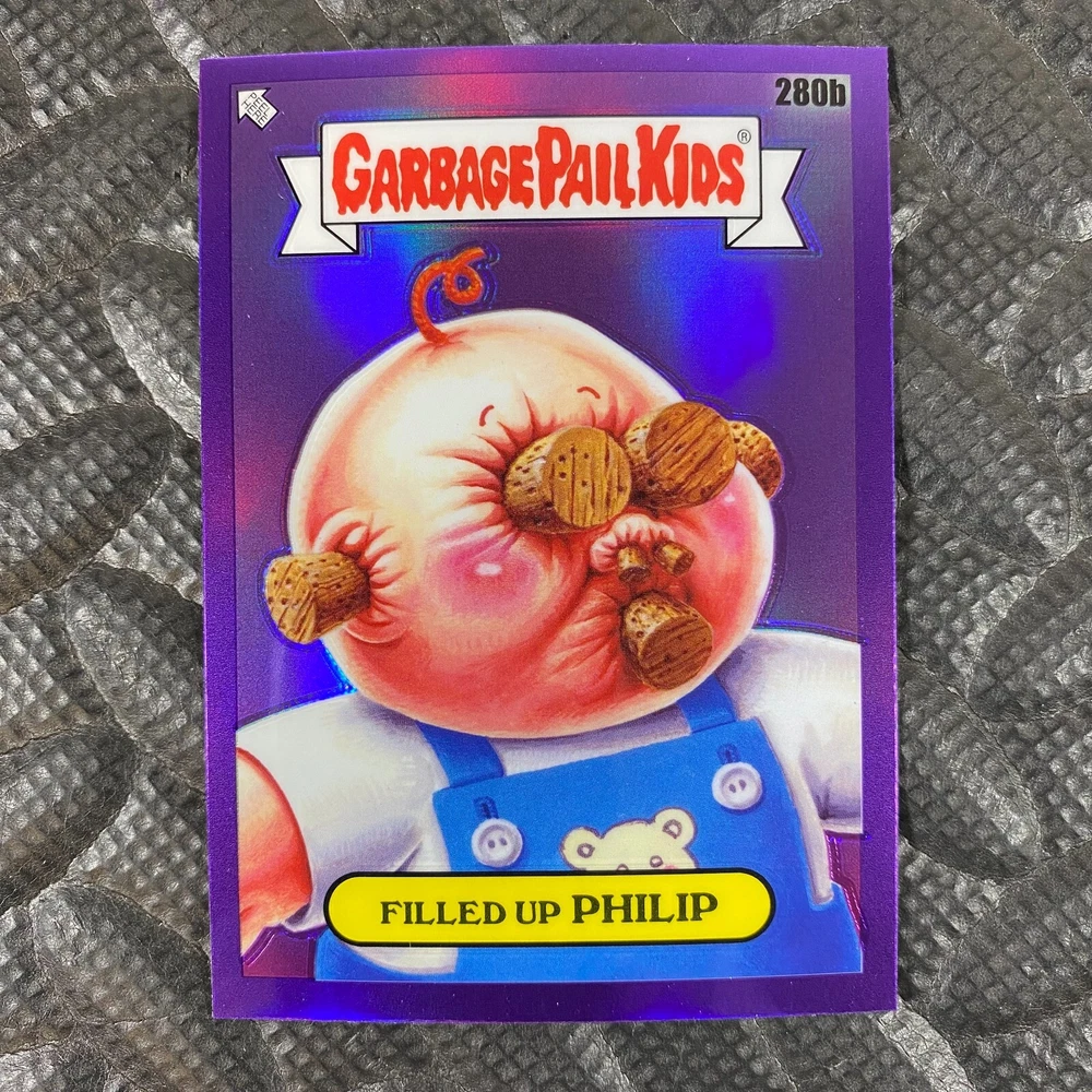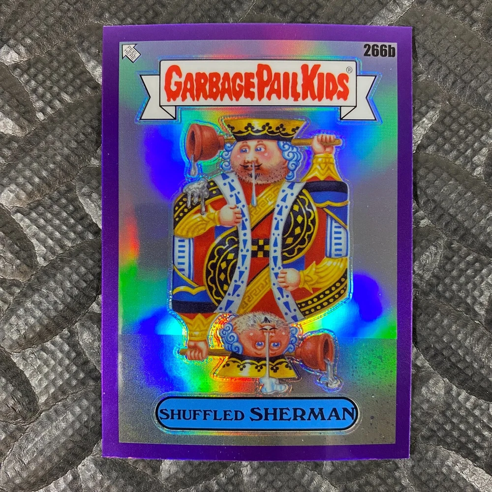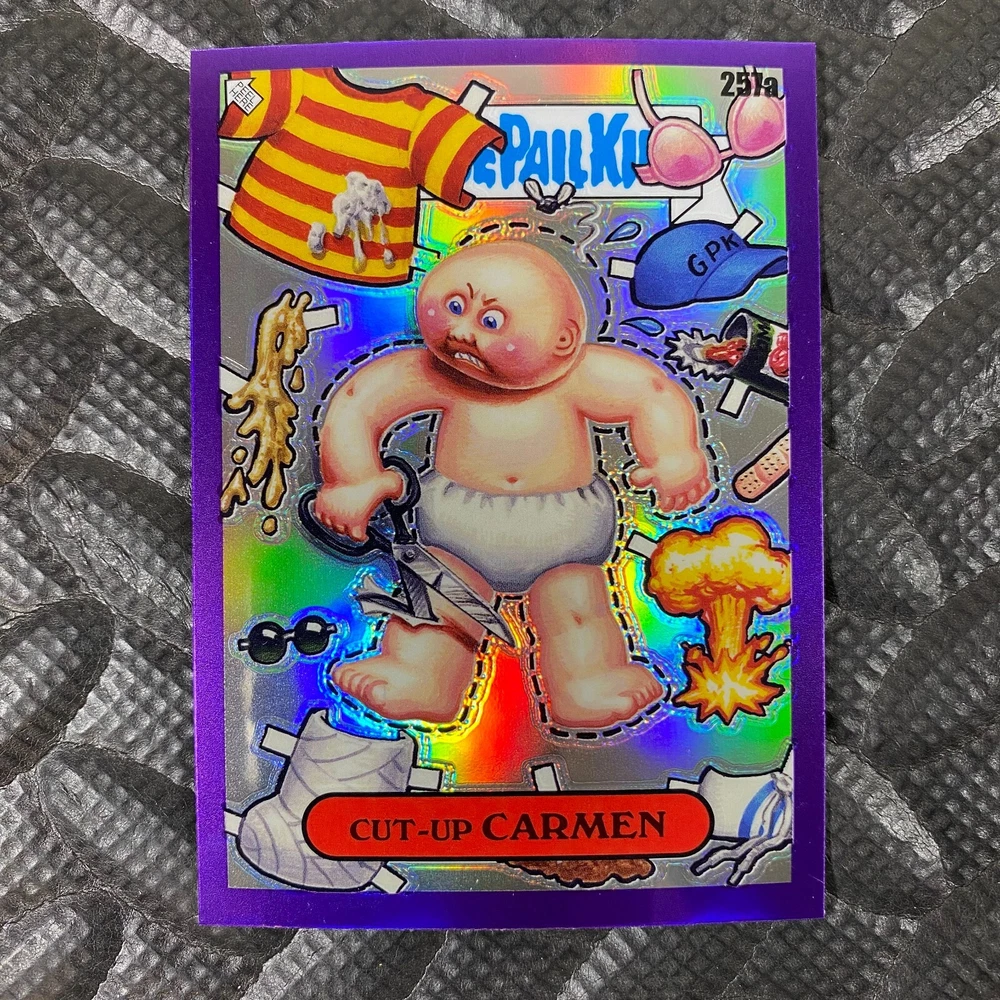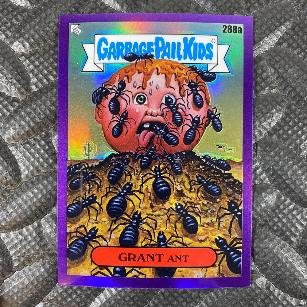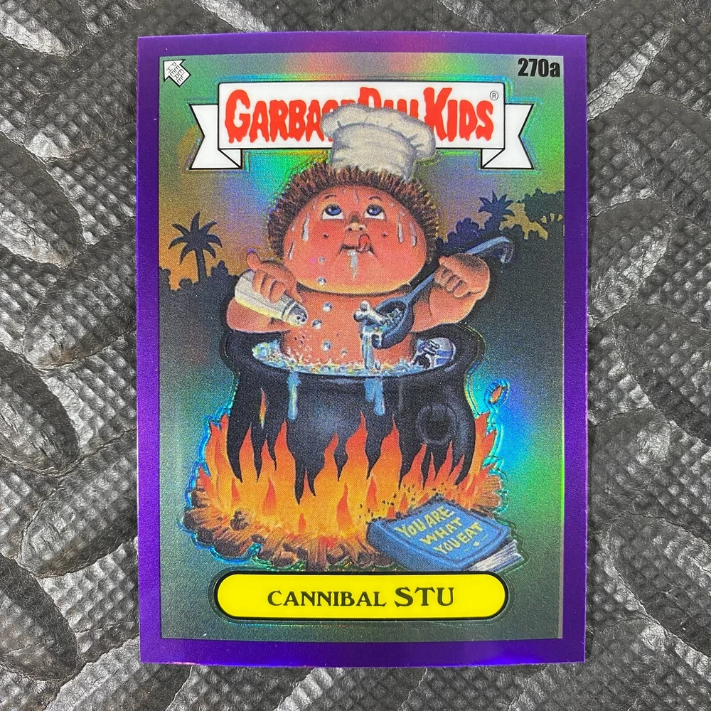 This listing is for your choice of any available 2025 Topps Garbage Pail Kids "Chrome 7" Purple Refractor card from the drop-down menu above. Check out my other listings for more single parallels from this same set. Any questions? Please ask before buying. As with all of my "pick-a-card" listings, I will be shipping with "eBay Standard Envelope". The rules of this envelope state that it cannot be too thick, so please expect your order to be packaged as follows: 1 to 6 cards will be slid into a single sleeve, the sleeve will then be slid inside of a semi-rigid Card-Saver. 7 to 12 cards will be slid into a double sleeve, 13 to 18 cards into a triple sleeve, 19 to 24 cards into a quadruple sleeve(up to six cards per sleeve). The double, triple and quadruple sleeve shipping will not have the Card-Saver. If you buy more than 1 card and want it packaged with more than 1 Card-Saver(or 1 sleeve per card), I kindly ask that you contact me before purchasing to be sure that this is possible to have it done with the stated shipping charge, or if additional shipping would be required. If you do not contact me, then you can expect to receive your order packaged as I have explained here. Please do not expect rigid top-loaders to be included, I don't normally keep a lot of them in stock, but if you message me prior to ordering I will be able to see if I have any that can be included with your order - additional shipping may be required. In order to get free combined shipping from this and any of my other "pick-a-card" listings, you must add all of your cards to the cart and check out when you are done shopping. If you do not use the cart you will be overpaying on shipping and I cannot refund you on over-payed shipping. So please use the cart and get your FREE COMBINED SHIPPING!
