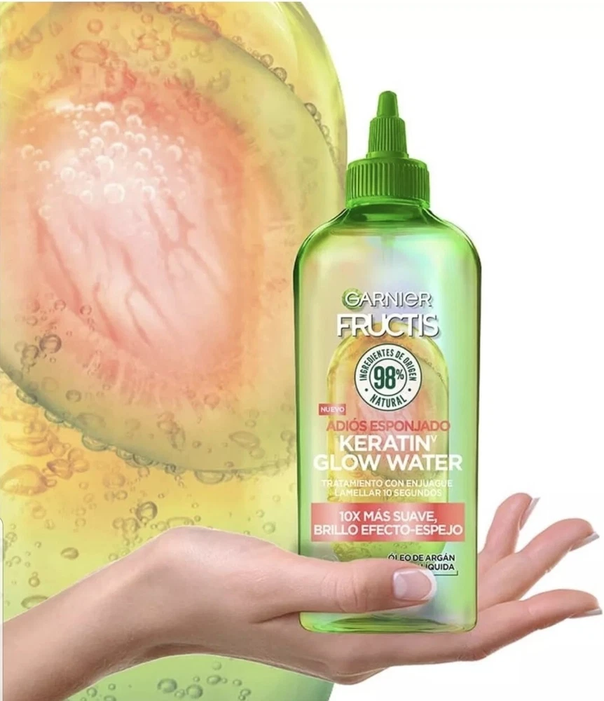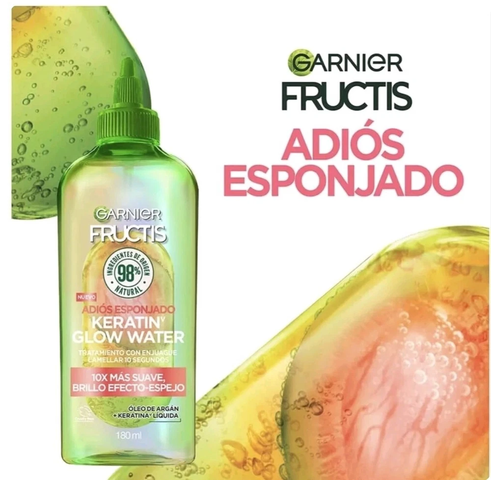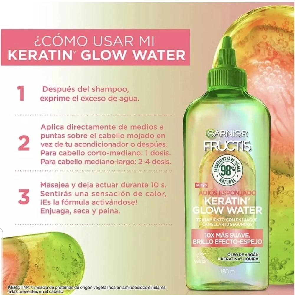 GARNIER FRUCTIS KERATIN GLOW WATER/ADIOS ESPONJADO/180ML/ANTI FRIZZ/6OZ.