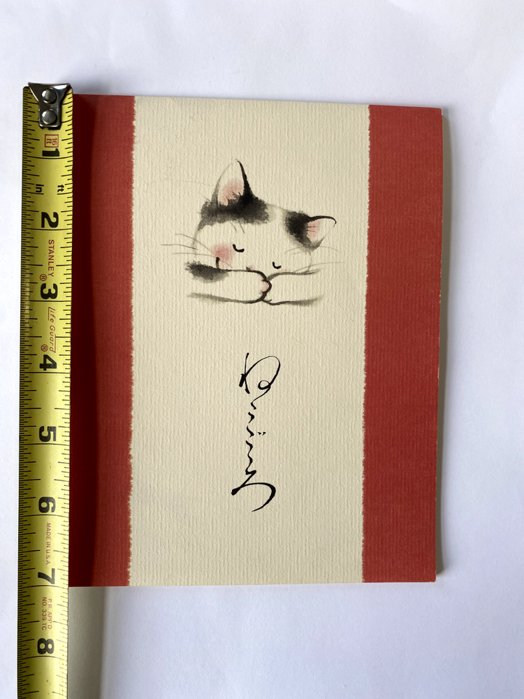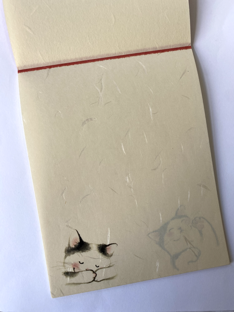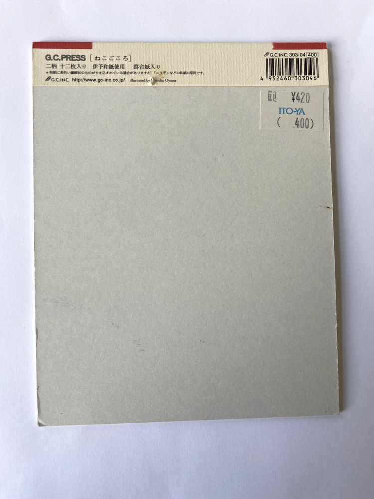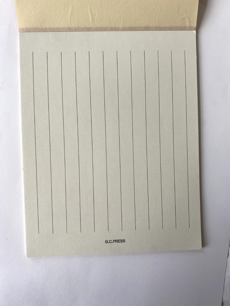 G.C. Press stationary note pad. It has 12 pages, the 2nd one being a lined page that is thicker than the other pages. Each page has a watercolor style print in the bottom left or right corner (it alternates). The paper is quite thin and a bit sheer as well. It has not been used, but isn't in any kind of packaging. It was originally purchased in Japan probably about 12 or 13 years ago. It measures 7 x 5.5 inches and hinges from the top.