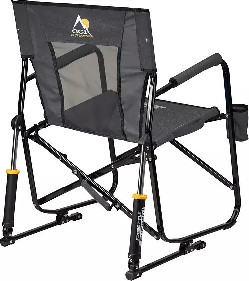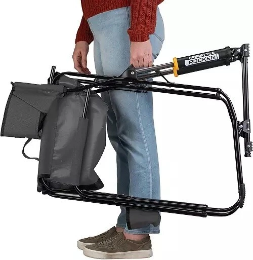 SPECS: Open dimensions: 25 in. W x 24 in. D x 34.8 in. H Folded dimensions: 4.9 in. W x 24 in. D x 34.8 in. H Seat height: 19.7 in. Unit weight: 12 lbs. Weight capacity: 250 lbs. DESIGN & DETAILS: Portable, collapsible rocking chair Spring-Action Rocking Technology™ provides smooth, relaxed swaying Mesh backrest offers ventilation for cooling comfort Eazy-Fold Technology™ makes the chair simple to open and close Beverage holder for accessibility to drink Powder-coated steel frame for durability Scratch-free nylon-coated feet Carry handles make transporting easy Folds flat for storage Brand : GCI Outdoor Country of Origin : Imported Style : 37019Z