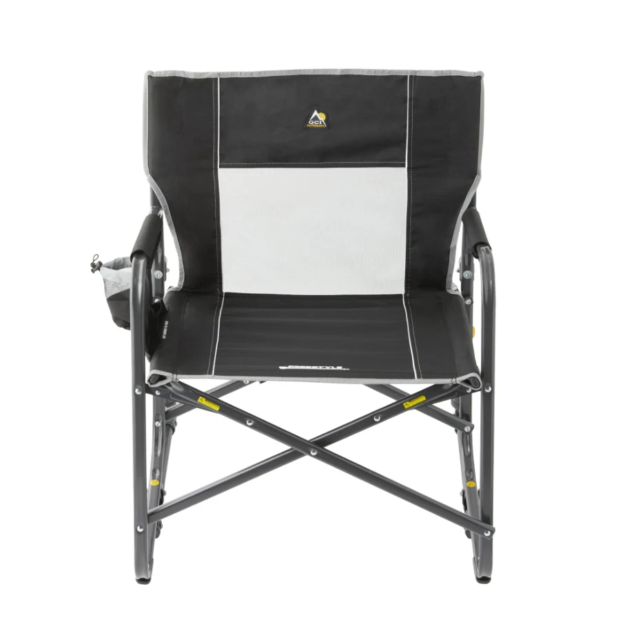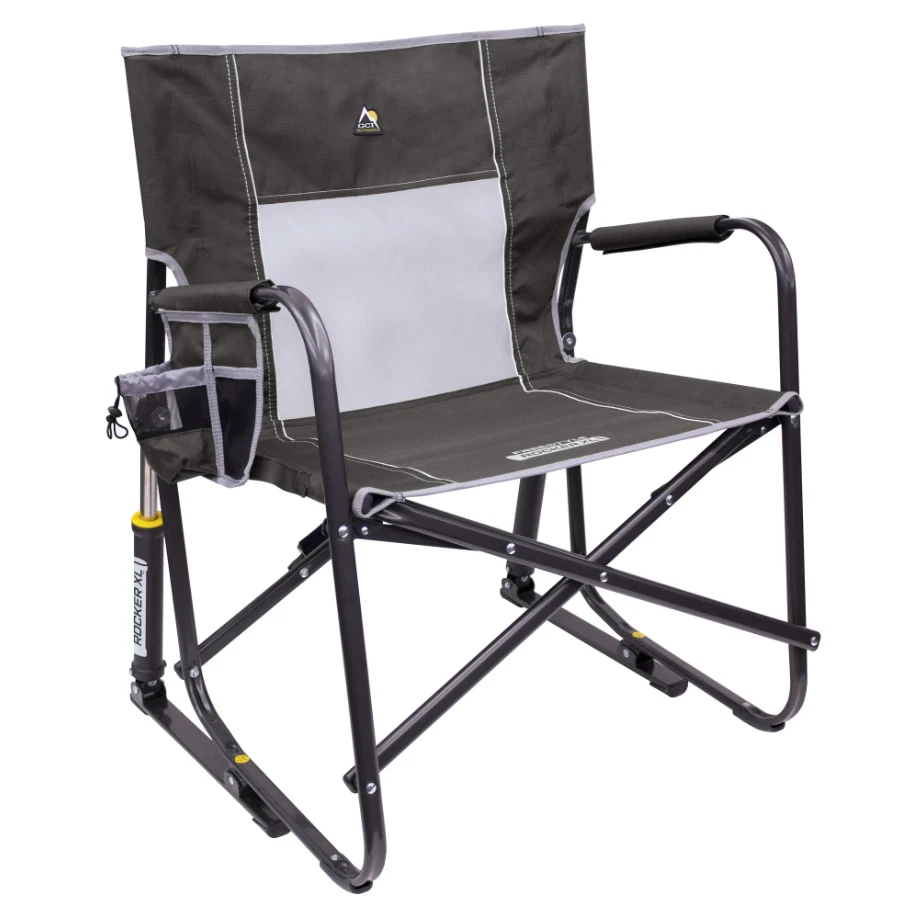 About this item GCI Outdoor Freestyle Rocker XL Heavy Duty Portable Folding Camping Chair, Black Over-sized height and width outdoor rocking chair Patented spring-loaded shocks for a smooth rocking motion Eazy-Fold Technology for safe and simple opening and closing Solid armrests for extra support when sitting down or standing up Durable, nylon mesh backrest for continual airflow to keep you cool in warmer weather Heavy-duty, powder-coated steel frame provides comfort and durability Fold-flat design for storage and transporting Convenient carry handle offers easy portability Convenient beverage holder and phone pocket Weight capacity: 400 lb Open Dimensions: 25.6" Depth x 26.4" Width x 34.8" Height (Seat Height: 20") Folded Dimensions: 25" Depth x 4.9" Width x 34.8" Heigh Item Weight: 13.4 lb Adult chair
