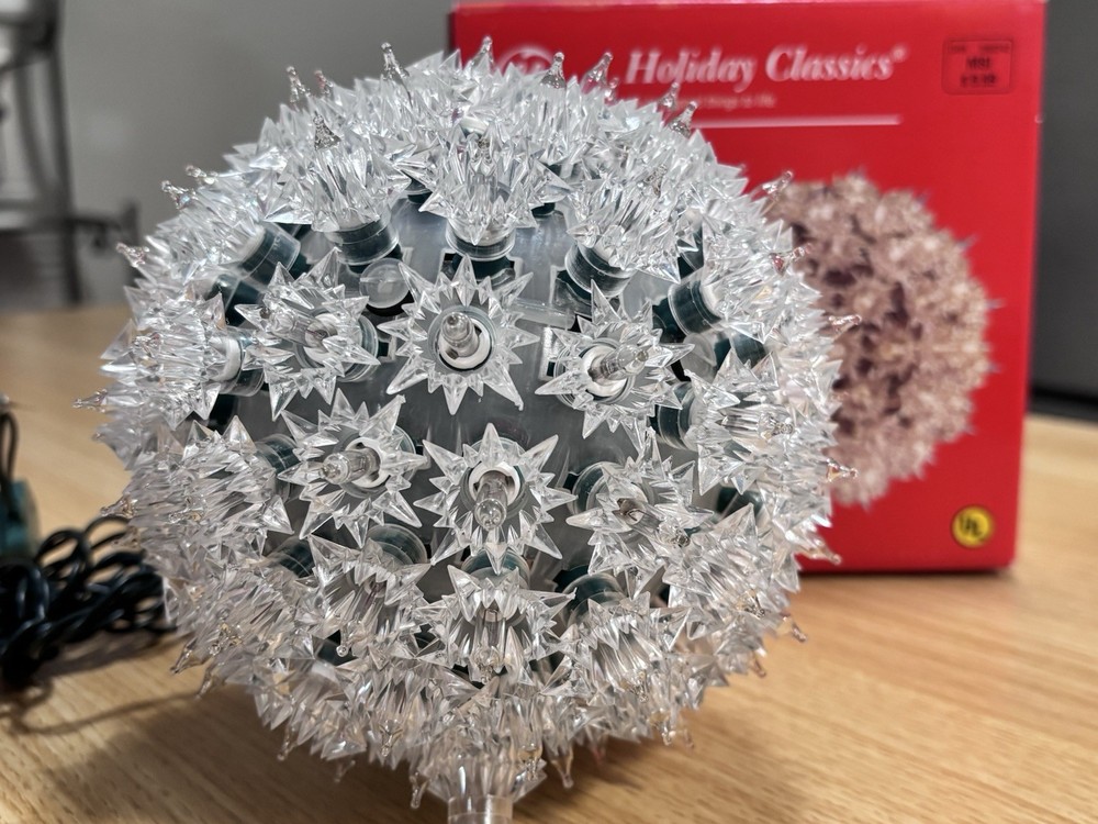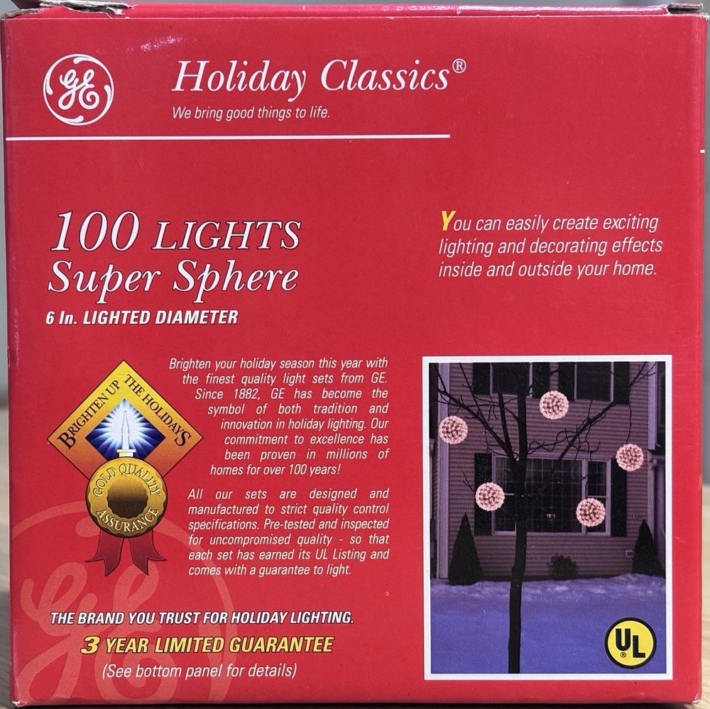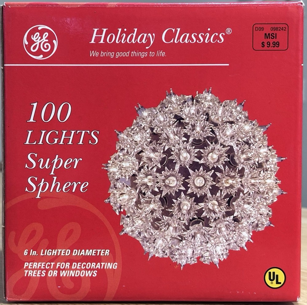 GE Holiday Classics 100 Light Super Sphere Clear 6in Hanging Christmas Decoration This GE Holiday Classics super sphere features 100 clear lights arranged in a striking starburst design for bright, even illumination indoors or outdoors. It has been fully tested and works perfectly, with no broken or missing tips, and comes with the original box. •Condition: Excellent preowned •Lights: 100 clear incandescent •Diameter: 6 inches •Color: Clear •Use: Indoor or outdoor •Features: Starburst plastic light covers •Cord: Standard plug in •Includes: Original box •Tested: Fully working This classic GE super sphere is perfect for decorating trees, windows, patios, or displays and ships securely for safe arrival.