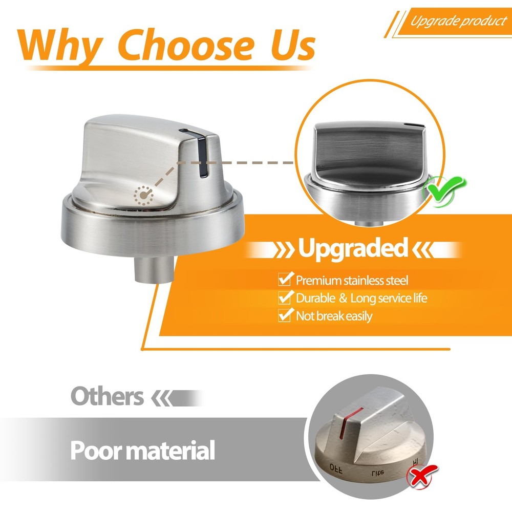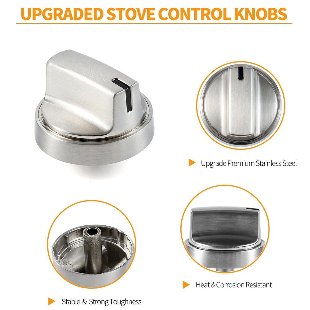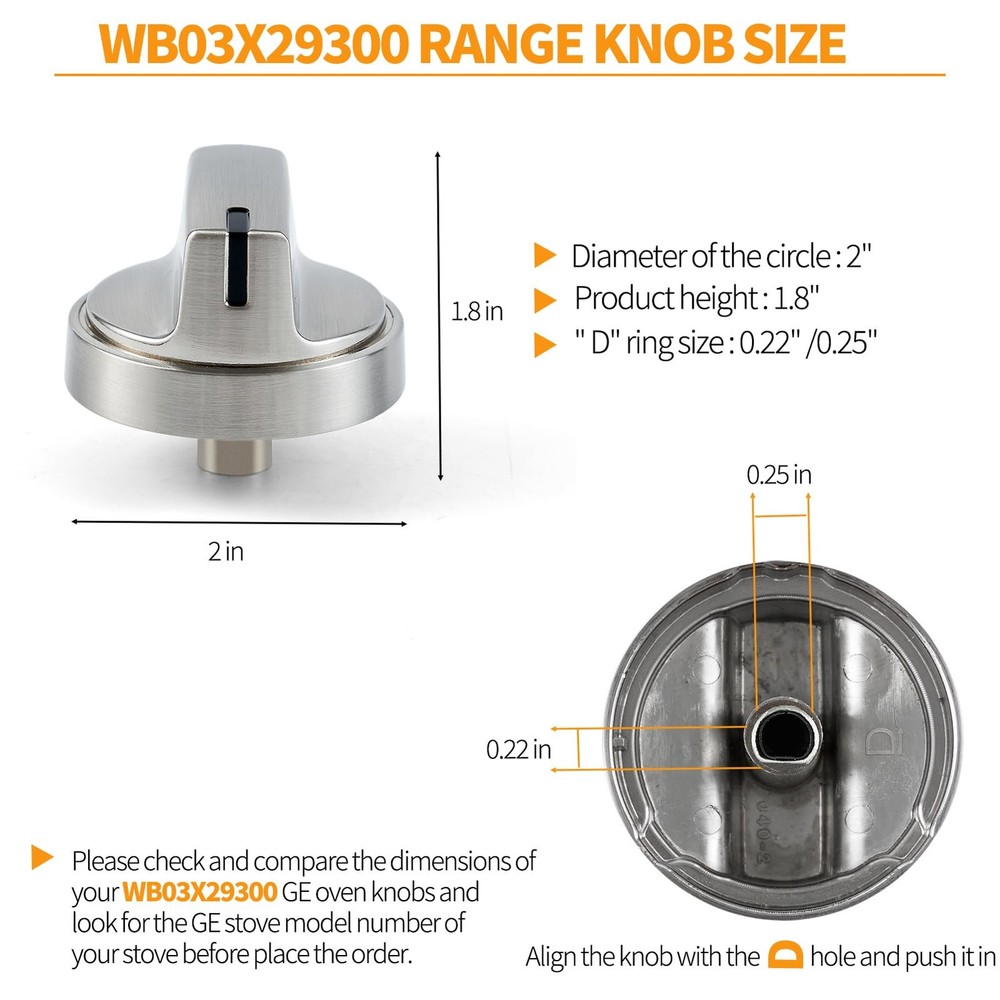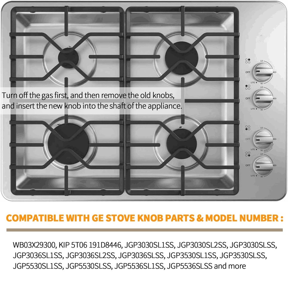 jgp3030slss knobs, ge range oven black knob 191d8446 or kip 5j73, jgp3036sl1ss replacement knobs, wb03x29300 knob replacement, wb03x29300 ge cooktop knobs, ge jgp3030slss cooktop knobs, ge range/stove 191d8446 knob, ge wb03x29300 range surface burner knob, ge stove knobs 191d8446, ge knob replacement 191d8446, ge jgp3030slss 30 inch gas cooktop, ge knob replacement jgp3030slss 【UPGRADE DURABLE STAINLESS STEEL CONSTRUCTION】The wb03x29300 knob replacement made of "100% upgrade premium stainless steel" that stronger and more sturdy than other plastic material, not easy to deform and rust/corrode, reduce ge stove knobs breakage. With proper maintenance, our ge range knobs can last pretty long 【COMPATIBLE GE STOVE KNOB PARTS NUMBER】WB03X29300, KIP 5T06 191D8446 and more ge cooktop knobs replacements. 【Please see details page for more models, hold down ''CTRL'' + ''F" on your keyboard to find your model number to compare with our listing.】【PACKAGE】5 Pcs "100% stainless steel" ge burner control knobs replacements 【COMPATIBLE WITH GE RANGE MODEL NUMBER】JGP3030SL1SS, JGP3030SL2SS, JGP3030SLSS, JGP3036SL1SS, JGP3036SL2SS, JGP3036SLSS, JGP3530SL1SS, JGP3530SLSS, JGP5530SL1SS, JGP5530SLSS, JGP5536SL1SS, JGP5536SLSS and more ge stove knobs replacements 【EASY FOR INSTALLATION】The ge stove top knobs kip 5t06 191d8446 is easy to install and use, without any tools, align the knob with the "D" shape hole and push it in, you can easily install the ge burner knobs replacement and quickly get your stove back to work, saving your time and money 【NOTE】Please check and compare the dimensions of your wb03x29300 ge cooktop knobs and look for the ge stove model number of your stove before place the order. If still confused, please feel free to e--mail us 【COMPATIBLE WITH GE RANGE KNOBS REPLACEMENTS】jgp3030slss knobs, ge range oven black knob 191d8446 or kip 5j73, jgp3036sl1ss replacement knobs, wb03x29300 knob replacement, wb03x29300 ge cooktop knobs, ge jgp3030slss cooktop knobs, ge range/stove 191d8446 knob, ge wb03x29300 range surface burner knob, ge stove knobs 191d8446, ge knob replacement 191d8446, ge jgp3030slss 30 inch gas cooktop, ge knob replacement jgp3030slss
