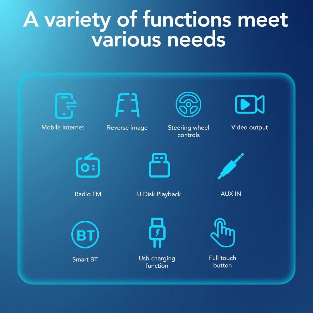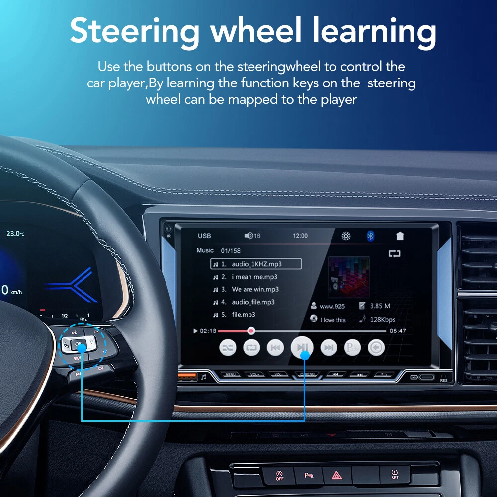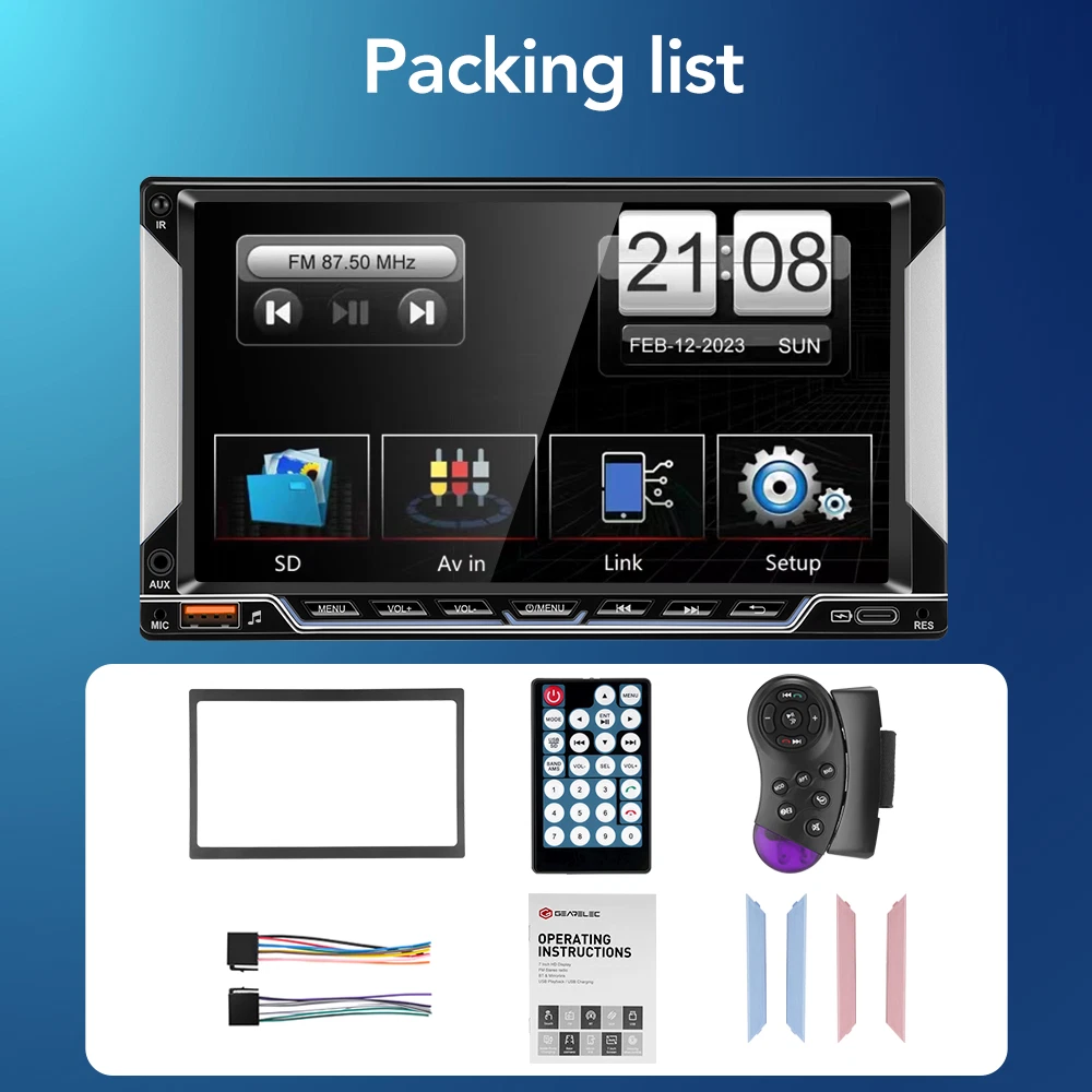 Specification: OS: WinCE Screen size: 7 inches Screen resolution: 800*480 Phone screen mirroring: supports (for iPhone/Android phones) GPS navigation: not supported Radio band: FM single band Radio Frequency : 87.5-108 MHz Backup camera input function: supports but camera not included Reversing detection method: tail line detection Brake reminder function: yes Steering wheel control function: supports Bluetooth function: supports Bluetooth version: 5.0 USB interface: yes Reset button: yes RCA jack: 2-channel video output, 1-channel backup camera input, 2-channel audio output, 1-channel video input Package included: 1 X Car Radio 1 X Power Cable 1 X Speaker Cable 2 Sets X Trim Strips 1 X Remote Control 1 X Manual Free GiftποΌ1 X 12LED reversing camera GEARELEC 2 DIN Car MP5 Player 7" Bluetooth Car Stereo Radio HD Touch Screen FM Feature: π Radio π Supports reading USB flash drives (audio/video/picture) π AUX function π Bluetooth function π Rearview camera input function π Original car steering wheel learning function π Phone screen mirroring function (supports for iPhone and Android phones) π Colorful button lights π USB Type C port for charging phones/tablets π Equipped with 2 sets of spare trim strips with different colors, change its appearance arbitrarily Specification: OS: WinCE Screen size: 7 inches Screen resolution: 800*480 Phone screen mirroring: supports (for iPhone/Android phones) GPS navigation: not supported Radio band: FM single band Radio Frequency : 87.5-108 MHz Backup camera input function: supports but camera not included Reversing detection method: tail line detection Brake reminder function: yes Steering wheel control function: supports Bluetooth function: supports Bluetooth version: 5.0 USB interface: yes Reset button: yes RCA jack: 2-channel video output, 1-channel backup camera input, 2-channel audio output, 1-channel video input Front AUX audio input: Yes Video decoding format: H.264 DIVX HD (720P/1080P) AVI/FLV/MKV/RMVB/MPEG/ASF/TS/H264/QT Audio decoding format: MP3/WMA/AAC/APE/OGG/M4A/RA/WAV Picture format: JPEG/PNG/BMP/GIF Language: English, French, Simplified Chinese, Japanese, Polish, Spanish, Portuguese, Turkish, Russian, Czech, Italian, Arabic, German, Indonesian Working temperature: -20β~+70β Wiring diagram: Note: There may be slight size deviations due to manual measurement, different measuring methods, and tools. The pictures may not reflect the actual color of the item because of different photographing lights, angles, and monitors. Package included: 1 X Car Radio 1 X Power Cable 1 X Speaker Cable 2 Sets X Trim Strips 1 X Remote Control 1 X Manual Payment Delivery details Return Feedback Contact us Payment * We accept PayPal only * Please verify your address during checkout. We are not responsible for any wrong or undeliverable addresses. * If there is anything wrong with the checkout or you need us to combine the shipping, please kindly feel free to contact us. Delivery details 1. Items are generally shipped out the next business day after your payment has been cleared (Sat. Sun. excluded.) 2. The shipment usually takes 3-5 business days (Saturday and Sunday excluded), if you need the item urgently, please contact us for detail before purchase. * We Ship to Payment address ONLY. So please confirm shipping Address prior to your payment. We are not responsible for any wrong or undeliverable addresses. Return Products with quality problem in 30 days can be returned and refund /replaced (Item in resalable condition) Products with quality problem in 1 year can be returned and repaired. (For more details, please read our warranty policy). Feedback Contact us if you have any question, please give us a chance to serve you, negative feedback couldnβt solve anything, communication Please! Contact us Welcome back to our store! Customers satisfaction is our top priority.
