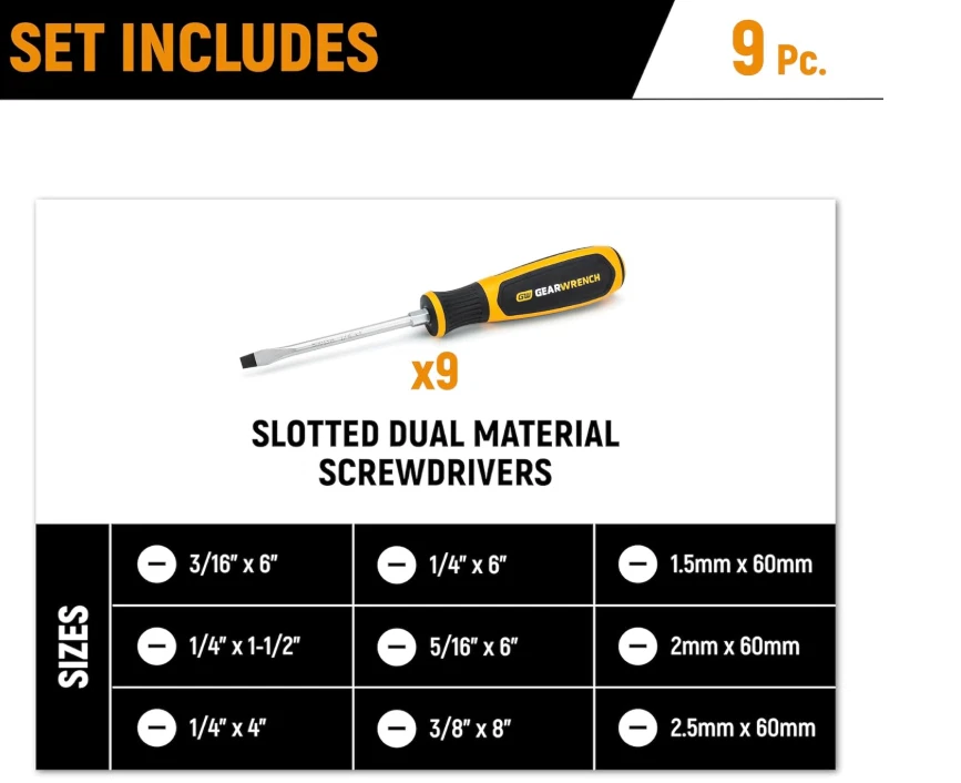 GEARWRENCH 9-Piece Slotted Screwdriver Set in Foam Tray - GWMSSCRSL Dual material handle offers a more comfortable grip and higher performance Non-slip black oxide tip for more secure fit in fastener Ergonomic tri-lobe dual material handle provides the optimal balance of strength and efficiency Full polish alloy steel screwdriver shaft prevents rust and corrosion “Speed Zone” handle design for faster rotation in low-torque applications When you receive your order and have any queries or concerns about the product, feel free to message us. We guarantee 100% resolution for you. Our commitment is to provide high-quality products and exceptional customer service, ensuring your trust and satisfaction.