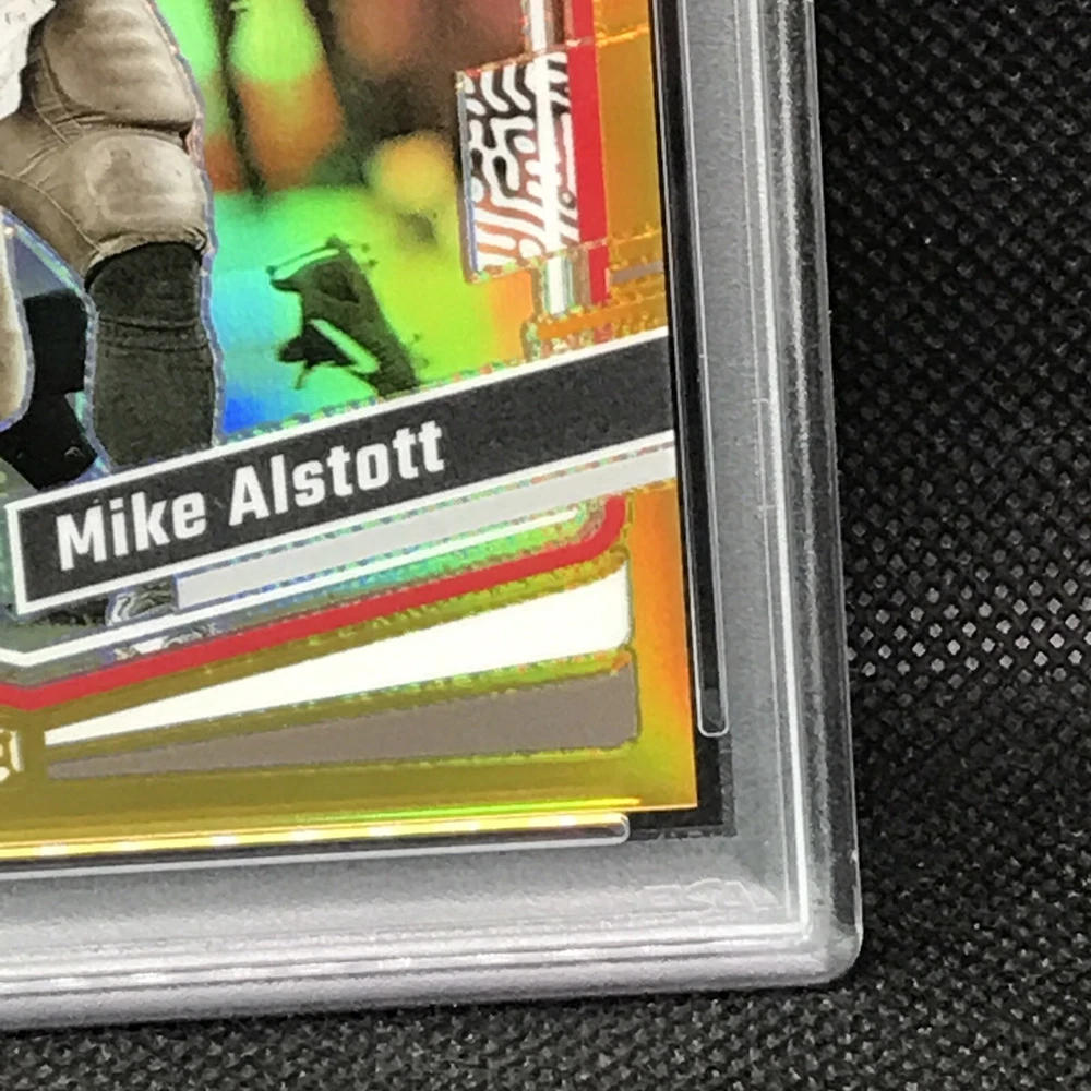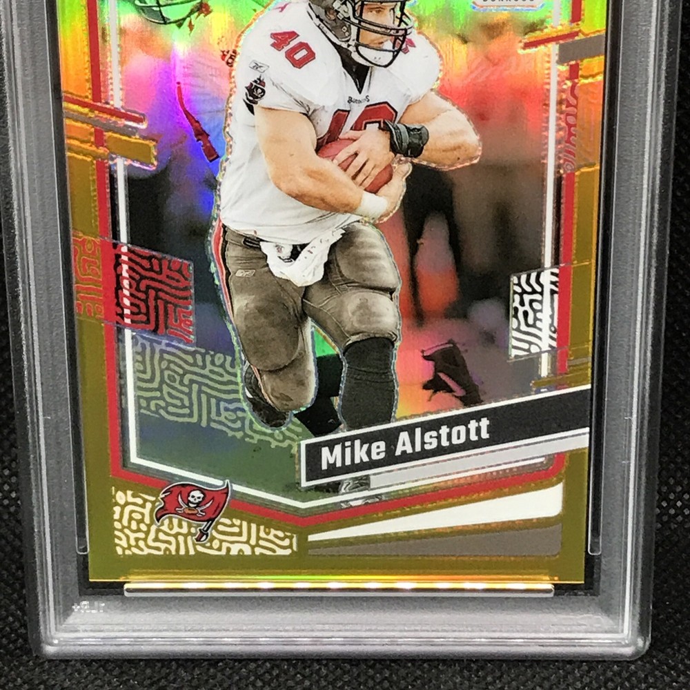 This is a rare and valuable sports trading card featuring Mike Alstott, a former player for the Tampa Bay Buccaneers. The card is part of the 2023 Panini Donruss Optic set and has a gold prizm parallel/variety, making it a highly sought-after item for collectors. It has been professionally graded by the Professional Sports Authenticator (PSA) and has a perfect grade of 10. The card is also serial numbered, hologrammed, and is a short print, making it an even more exclusive and valuable addition to any collection. This card is a must-have for any NFL or sports trading card enthusiast.