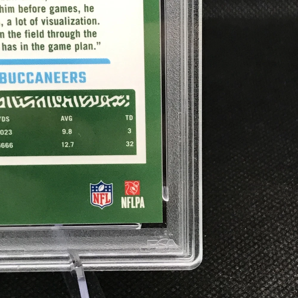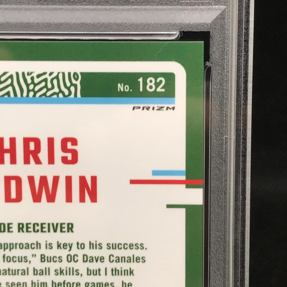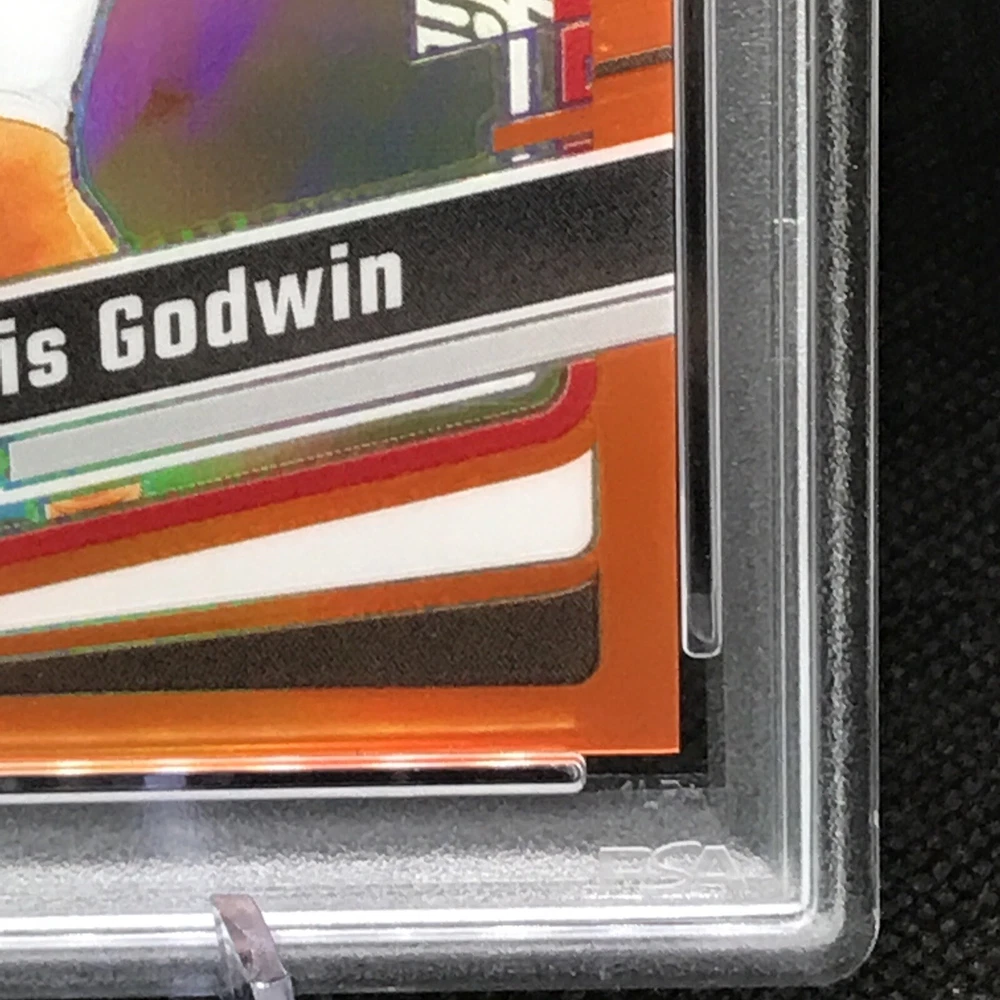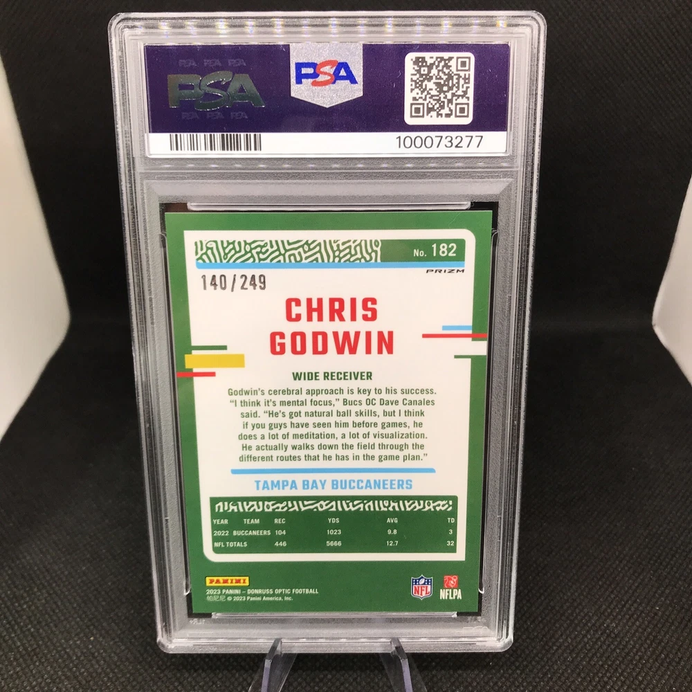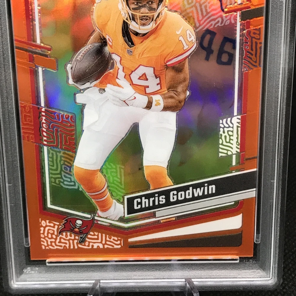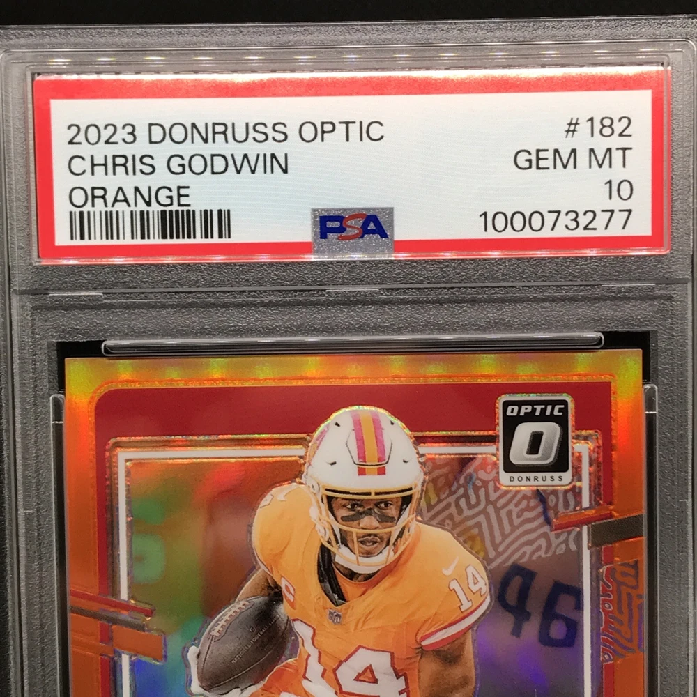 This rare and highly sought-after sports trading card features Chris Godwin of the Tampa Bay Buccaneers in a limited edition, exclusive collectors' edition. The card is perfectly graded at a PSA 10, ensuring its authenticity and quality. It boasts a stunning orange prizm color match, hologram, and serial number, making it a true gem for any collector or fan. The card is part of the 2023 Donruss Optic Football set and is certified with the number 100073277. With its short print, parallel/variety, and collectors edition, it's a must-have for any avid collector or fan looking to complete their collection. Don't miss out on this opportunity to own a piece of NFL history.