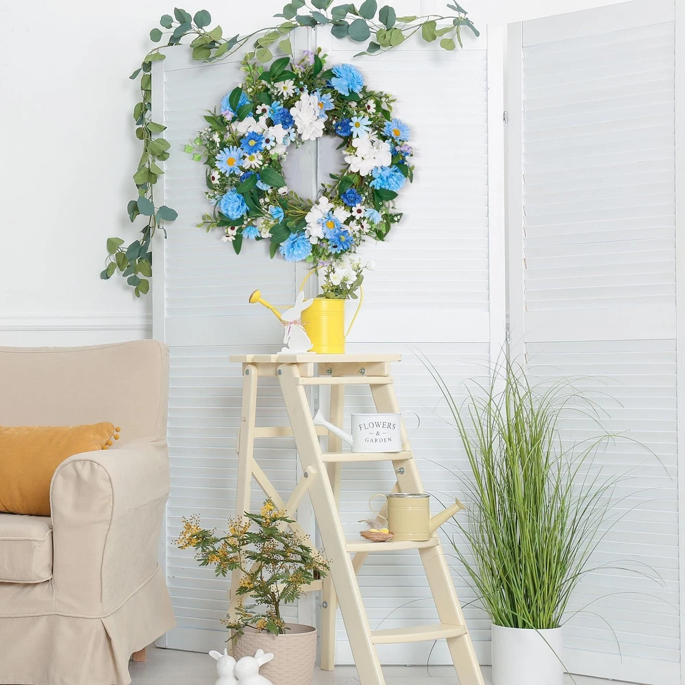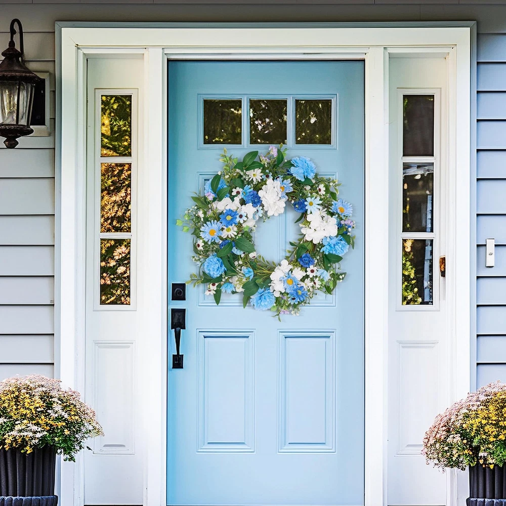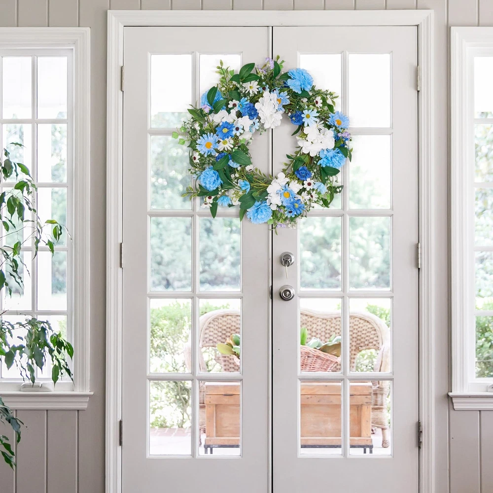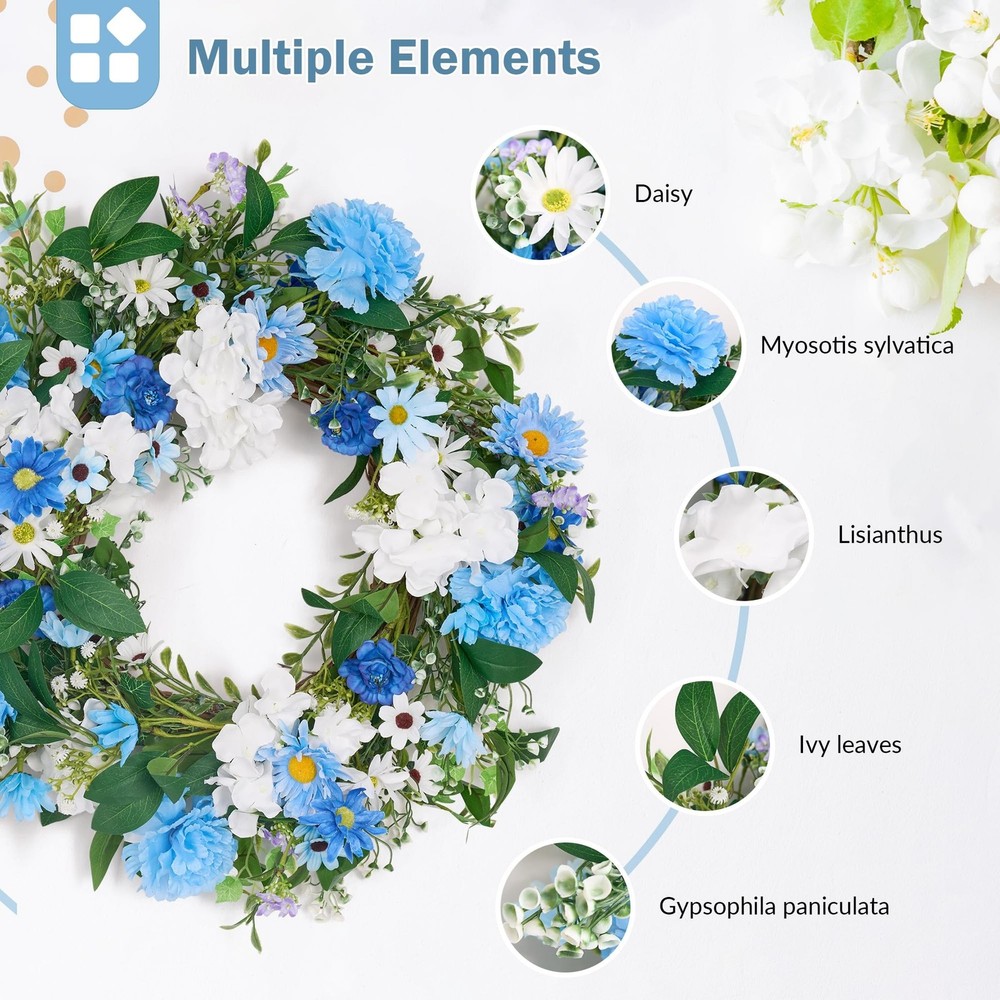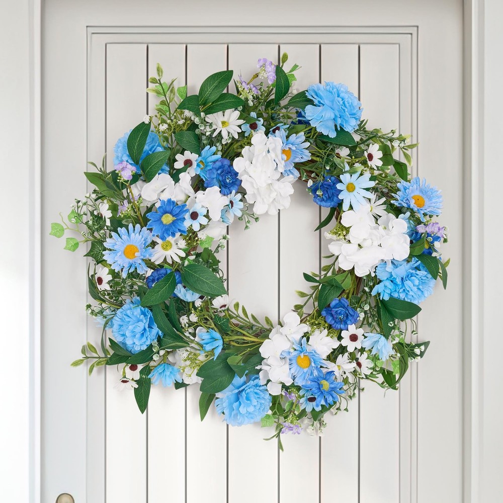 GENMOUS 24 Inch Summer Spring Blue Daisy Wreath for Front Door, Rustic and Farmhouse Flower Wreath with Myosotis sylvatica, Indoor&Outdoor Wedding Wall Home Decor Product Details Color: Daisy Brand: GENMOUS & CO. MPN: Does not apply UPC: Does not apply EAN: Does not apply Color: Daisy Brand: GENMOUS & CO. Material: Natural Foliage and Flowers Shape: Round Product Dimensions: 24"D x 24"W x 3"H Manufacturer: GENMOUS & CO. Product Dimensions: 24 x 24 x 3 inches Item Weight: 1.76 pounds Manufacturer: GENMOUS & CO. Country of Origin: China Date First Available: November 25, 2024 Charming Blue Flower Wreath: This front door wreath features a delightful mix of light blue Daisy, Myosotis sylvatica, Lisianthus, Gypsophila paniculata and Ivy leaves combined with soft, touchable leaves. The combination creates a lush, life-like appearance that adds a touch of elegance to any space. Generous Size & Full Appearance: With an outer diameter of 24 inches, this large and leafy flower wreath is perfect for making a statement. It's ideal for decorating front doors, back doors, windows, and yards, offering a full and luxurious look. Versatile Decor for Special Occasions: Whether you're planning a romantic spring or summer wedding, party, or simply want to enhance your home decor, this blue wreath is a versatile choice. It can be hung on doors, windows, walls, chairs, and cars, making it perfect for weddings, celebrations, and everyday beauty. Rustic & Farmhouse Style: The spring wreath's rustic and farmhouse design ensures it complements various home decor styles, from wooden doors to metal finishes. Its coastal flair adds a touch of elegance, making it a charming addition to any room or outdoor space. Easy Care & Long-Lasting Beauty: Made from high-quality, durable materials, this summer door wreath requires minimal maintenance. Simply fluff it to shape before hanging and keep it indoors or in covered outdoor areas to preserve its freshness and color for years to come.