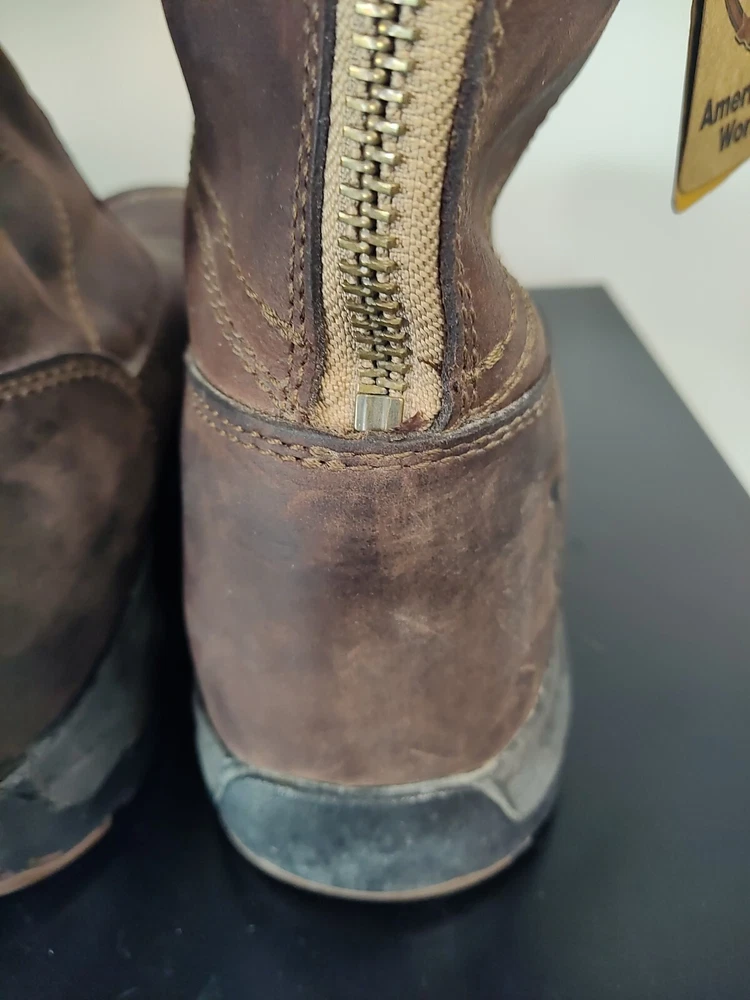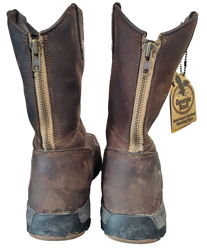 GEORGIA BOOT GB00226 MEN'S ATHENS PULL-ON WORK BOOT-- SIZE 11W--DARK BROWN **Please see pictures for any nicks/scuffs/cuts/separation. ** Please message me with any questions. Unlined Full-grain leather upper Rubber outsole with EVA midsole AMP (Advanced Memory Polyurethane) insole Anchor Disk by Georgia - provides added heel support TPU shank 11 Inches in height Shaft height and circumference may vary by size 14-inch calf circumference Moc toe ASTM F2892 electrical hazard standard 1 1/2" heel Weight: 1.5LB PER shoe Back zipper for easy on/off 3/4 Stitch out construction for added flexibility