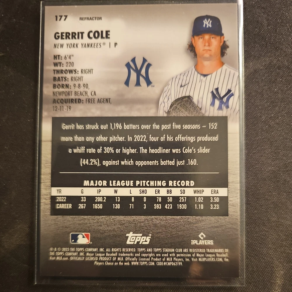 This is a rare and highly sought-after GERRITT COLE 2023 Topps Stadium Club Chrome #177 card for fans of the New York Yankees. The card features a stunning image of Gerritt Cole and is in near mint or better condition. It is perfect for collectors and fans alike who want to own a piece of baseball history. The 2023 Topps Stadium Club Chrome #177 is an ungraded card that comes from the Chrome insert set and is manufactured by Topps. It is a sports trading card that is perfect for any fan of the MLB and is sure to be a valuable addition to any collection. Don't miss out on this opportunity to own a piece of baseball history!